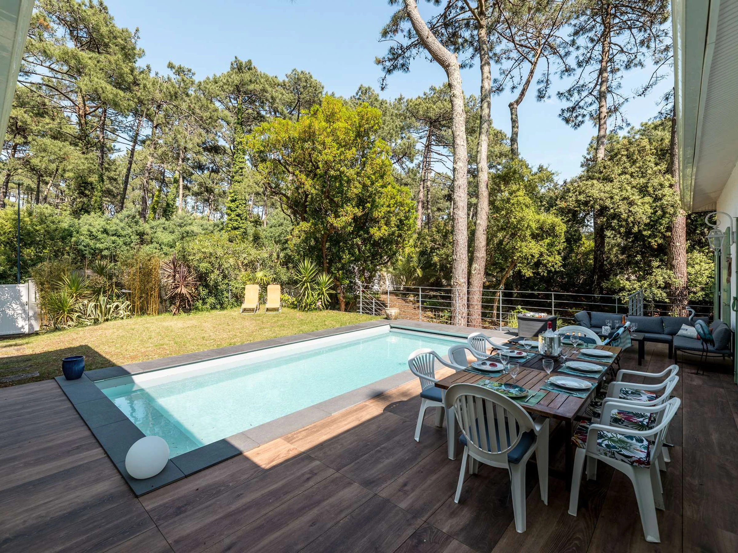 Vous pourrez vous détendre dans la piscine au sel chauffée de 7 m sur 3 au sein d’un jardin clos de 1 180 m² verdoyant et sans vis-à-vis.