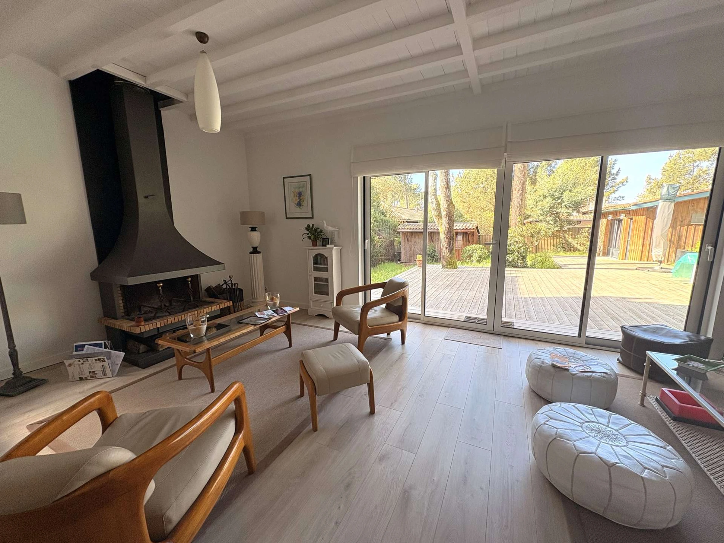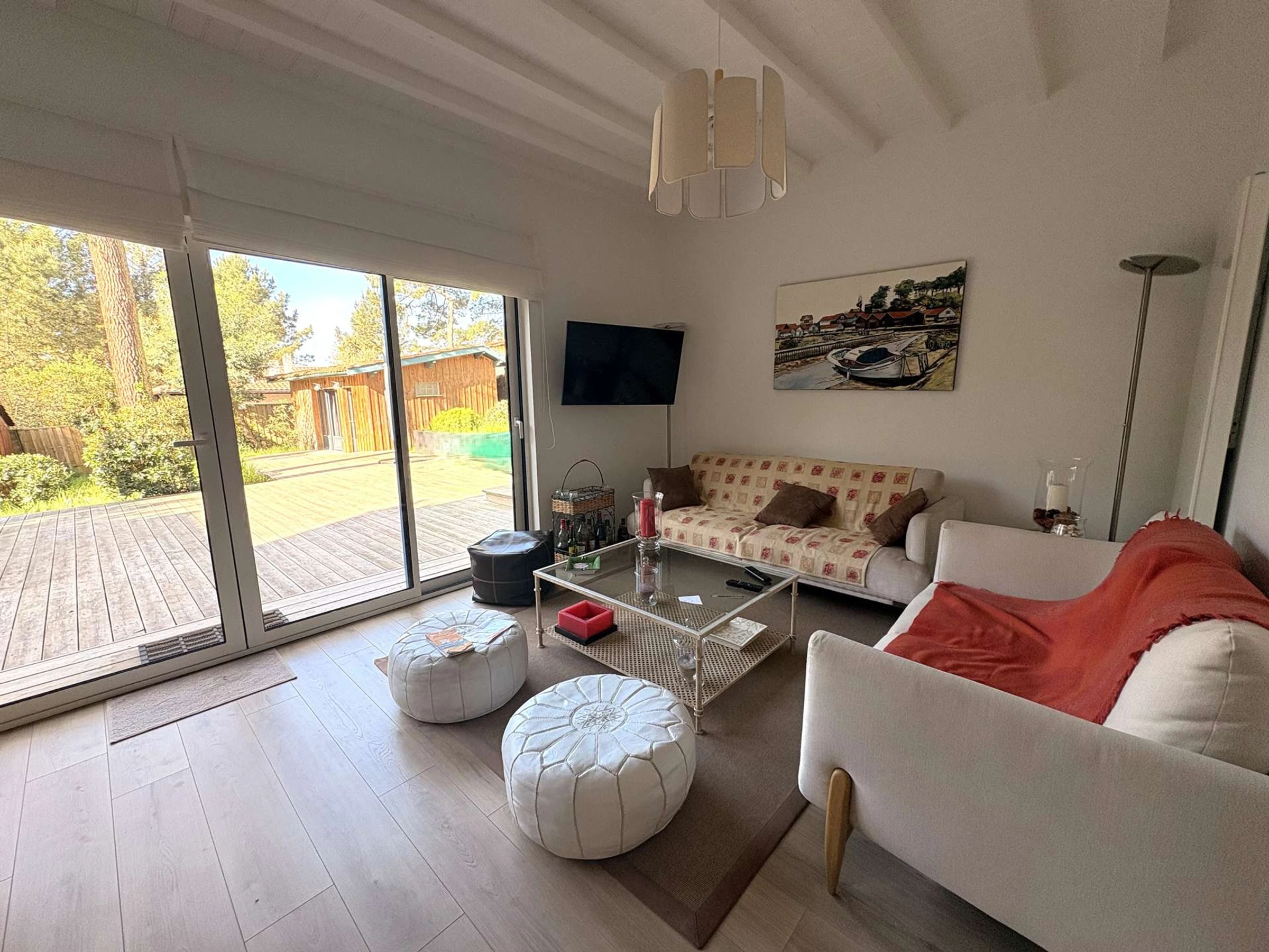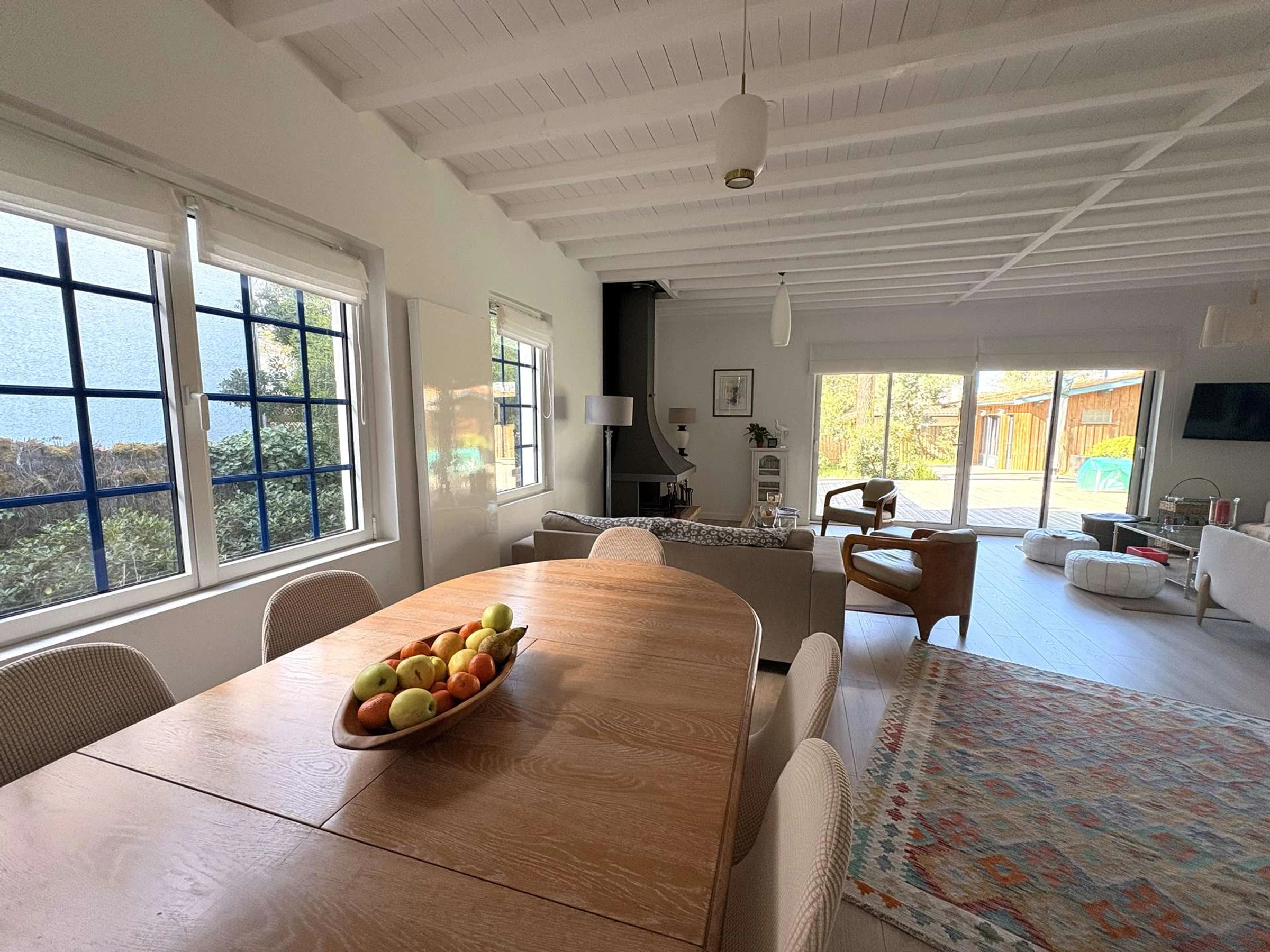 Elle dispose d'un spacieux salon-séjour de 50 m² baigné de lumière, avec télévision, qui s'ouvre sur une superbe terrasse en bois de 80 m² orientée Sud-Ouest. La cuisine est entièrement aménagée et équipée, complétée par un SAS avec machine à laver.