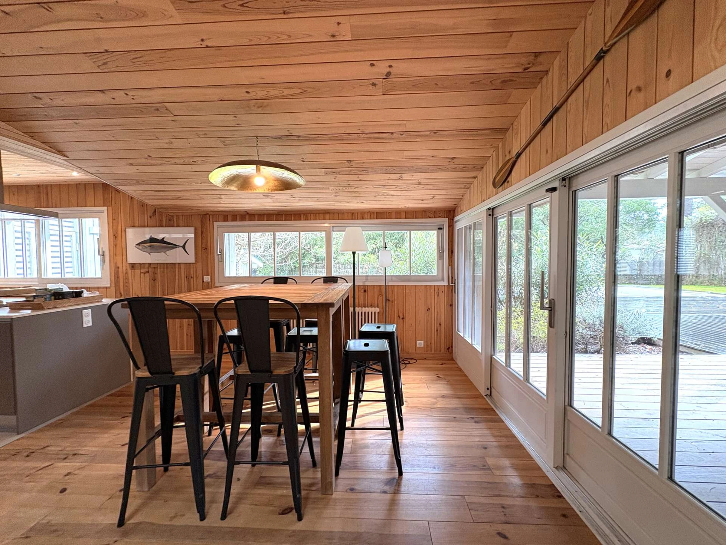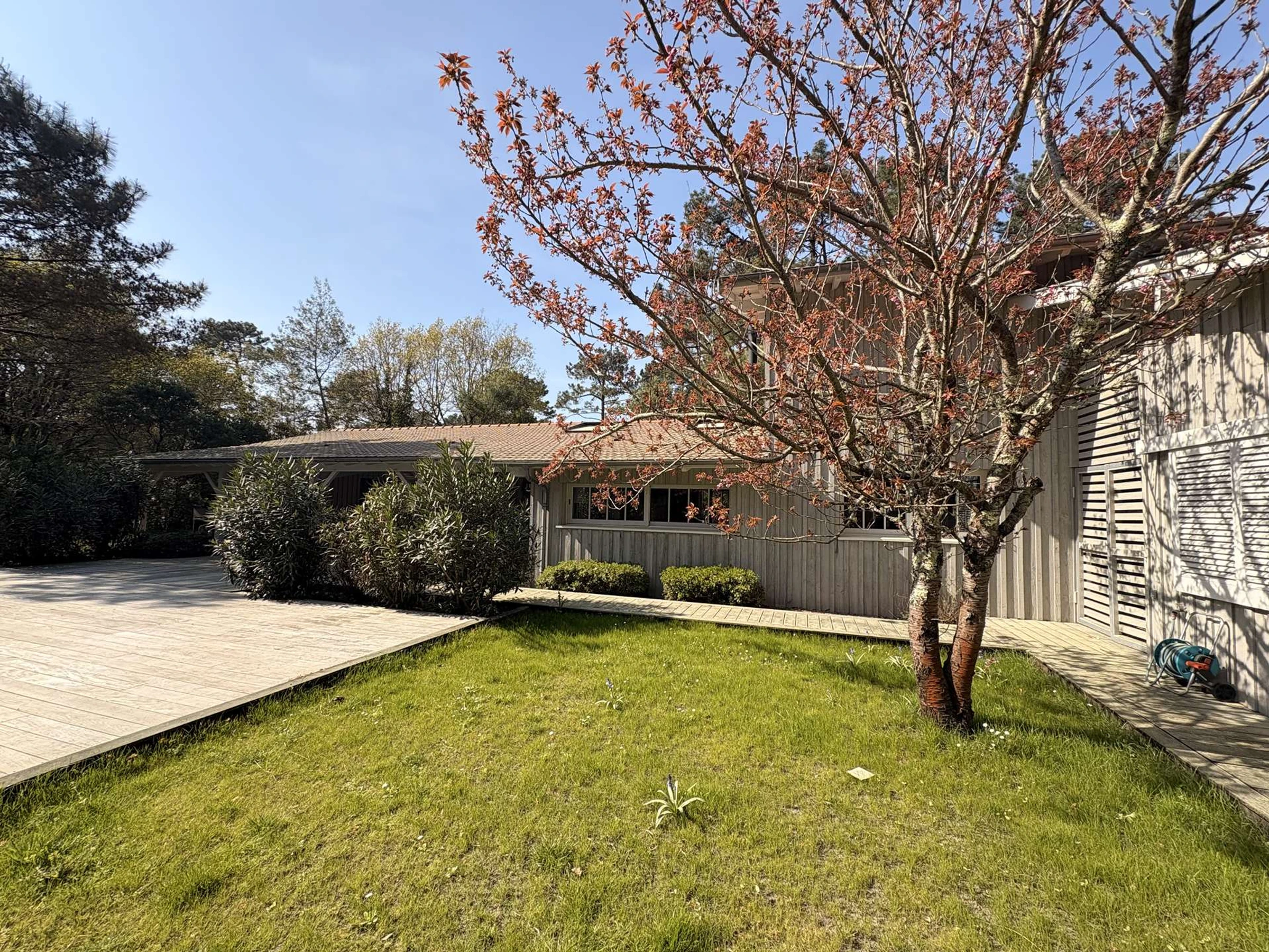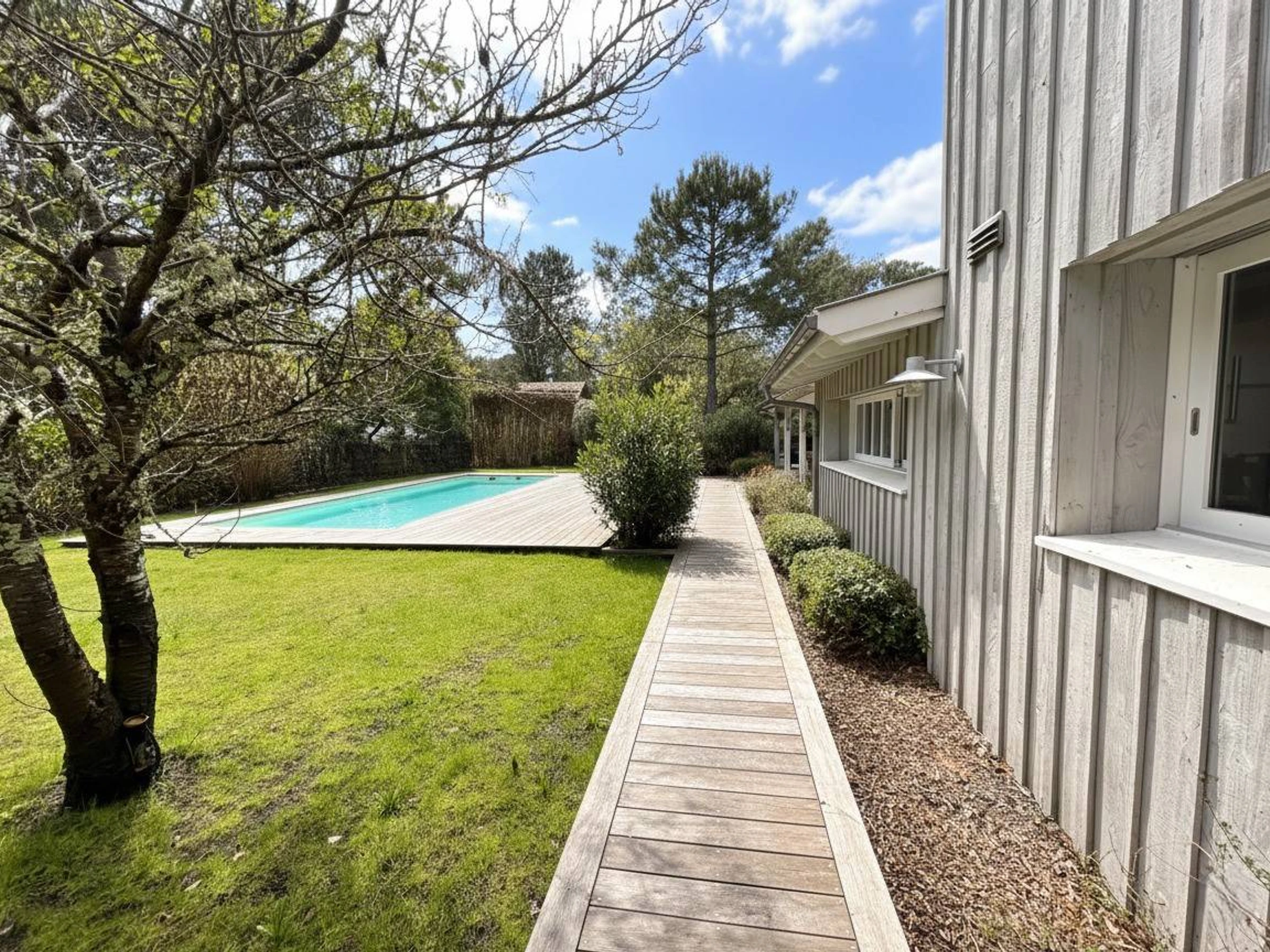 Emplacement idéal pour cette charmante villa en bois de 240 m² avec piscine chauffée 4x11m située à Petit-Piquey à seulement 3,5 km des plages océanes accessibles par les pistes cyclables sécurisées et à quelques minutes du Bassin d’Arcachon.