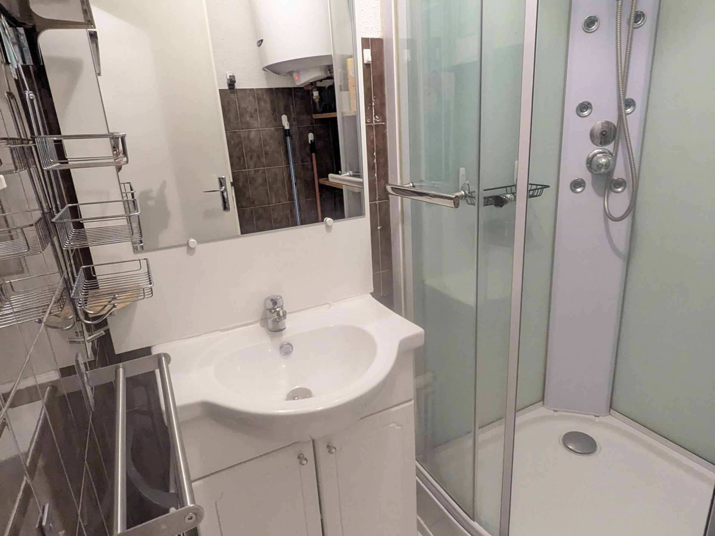 Salle de bain avec cabine de douche, lavabo et WC. Ce bien est équipé d'une cafetère à filtre mais ne dispose pas d' appareil à raclette.