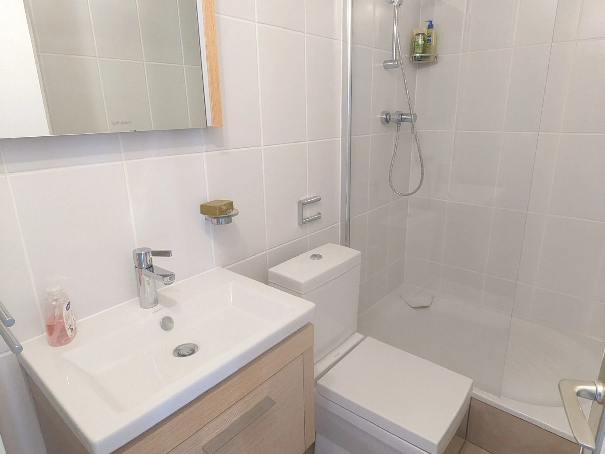 Salle de bain avec baignoire, lavabo, et WC. Ce bien est équipé d'une cafetière à filtre mais et dispose d'un appareil à raclette.