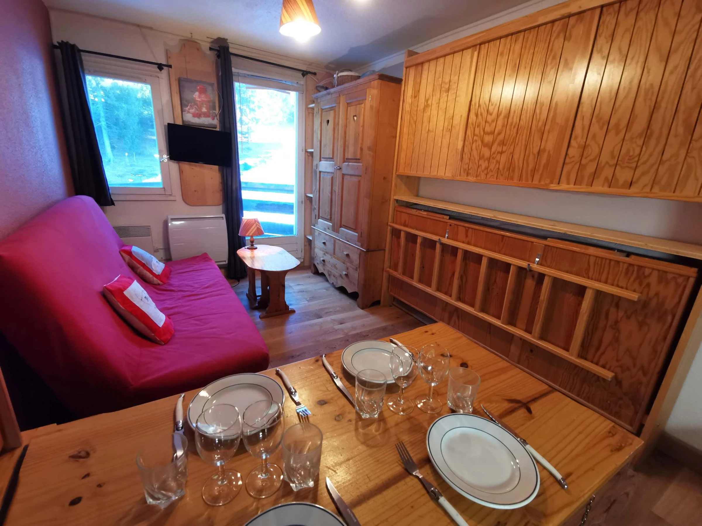 - Séjour : 1 clic clac + 2 lits superposés rabattables.