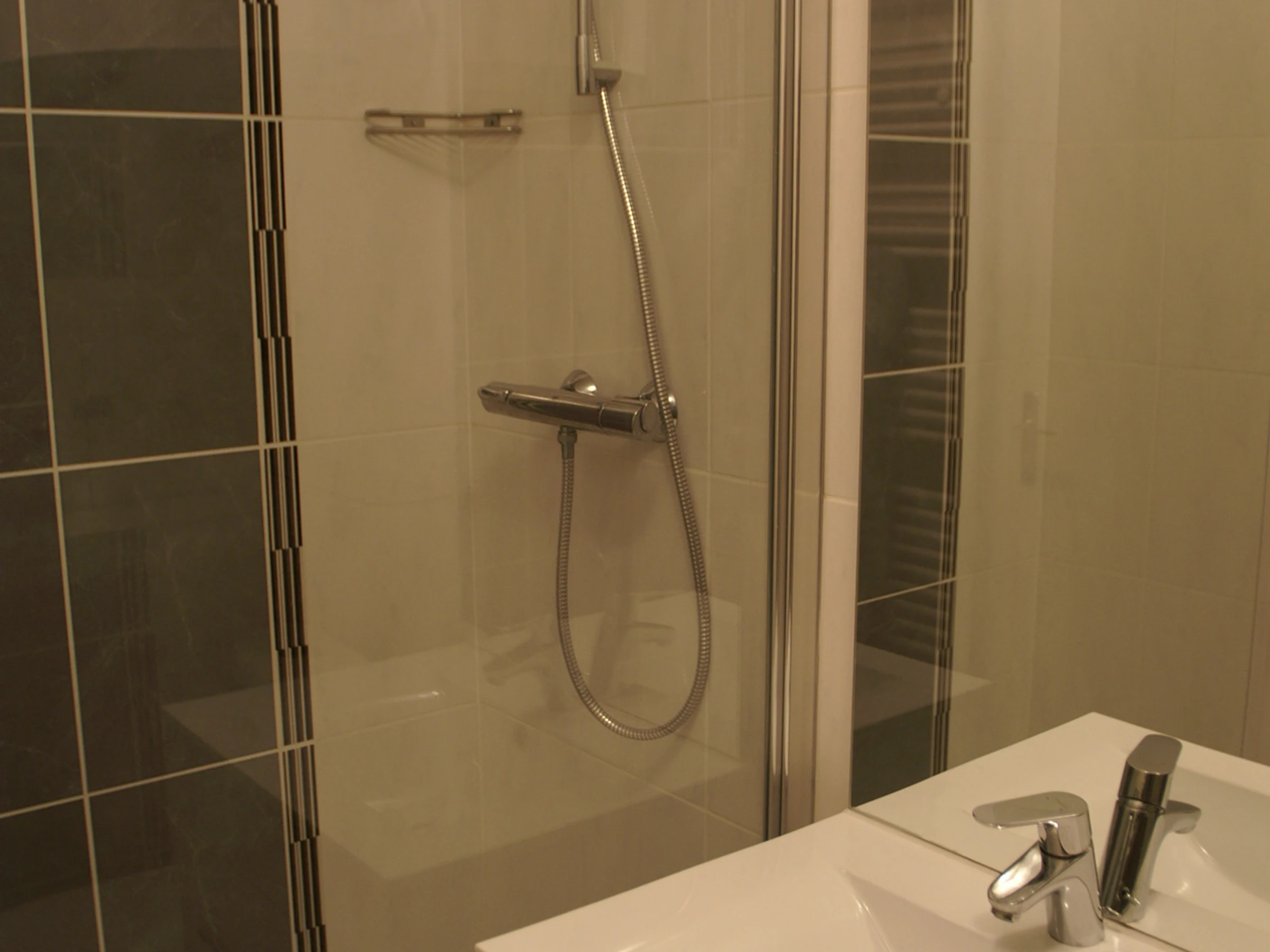 Salle de bain avec douche, lavabo et WC. Ce bien est équipé d'une cafetière à filtre mais n'a pas d'appareil à raclette.