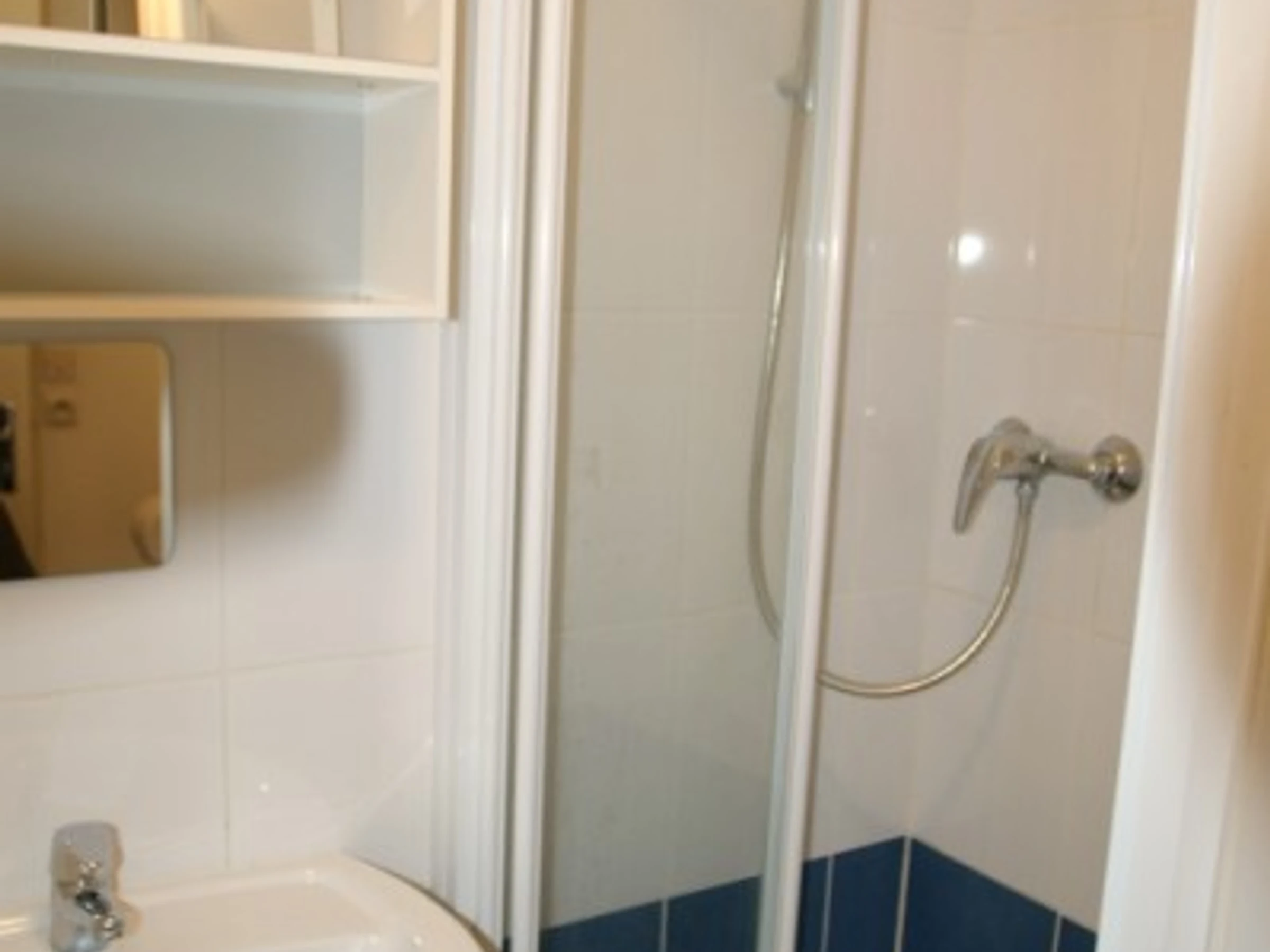 Salle de bain avec douche, lavabo et WC. Ce bien est équipé d'une cafetière à filtre mais n'a pas d'appareil à raclette.