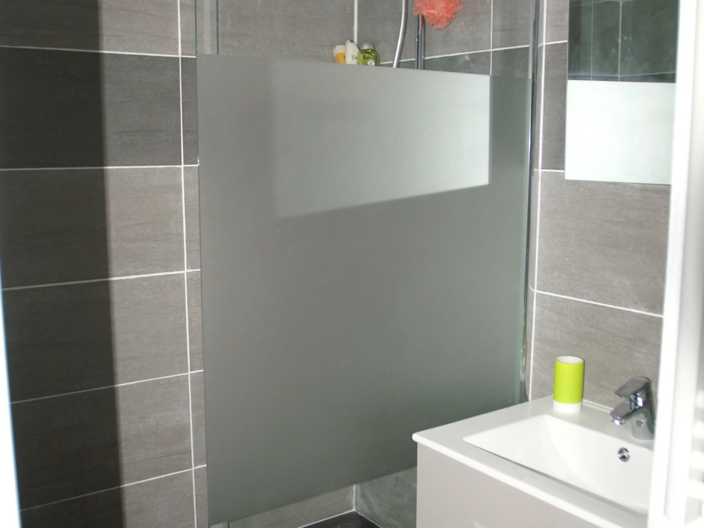 Salle de bain avec douche, lavabo et sèche-serviette.