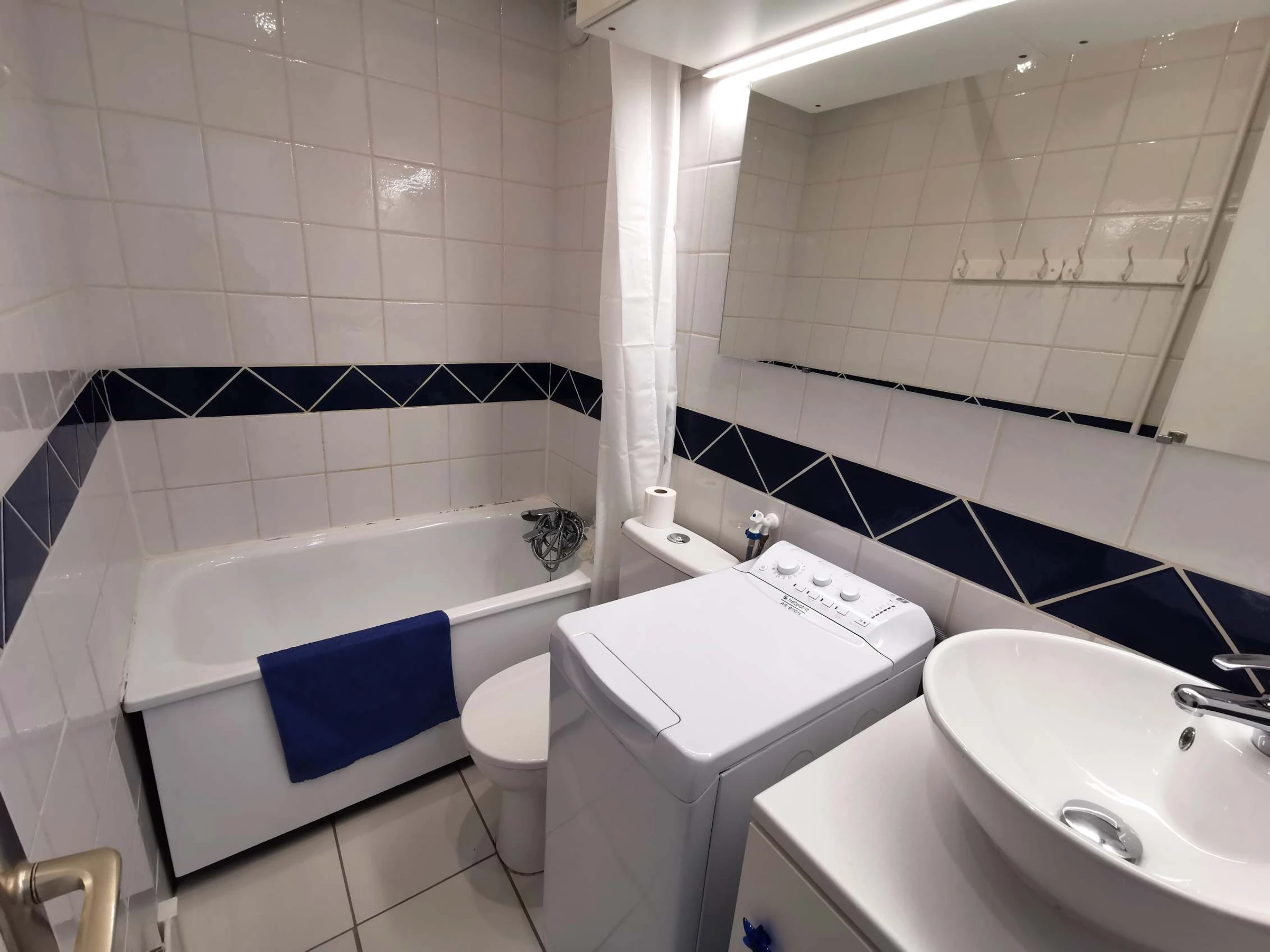 SDB avec baignoire, lavabo, WC, lave-linge.