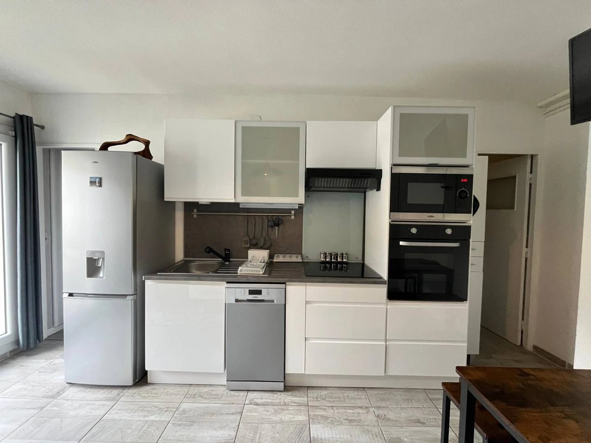 D’une cuisine ouverte entièrement équipée : lave-vaisselle, micro-ondes, four, plaques de cuisson, réfrigérateur.