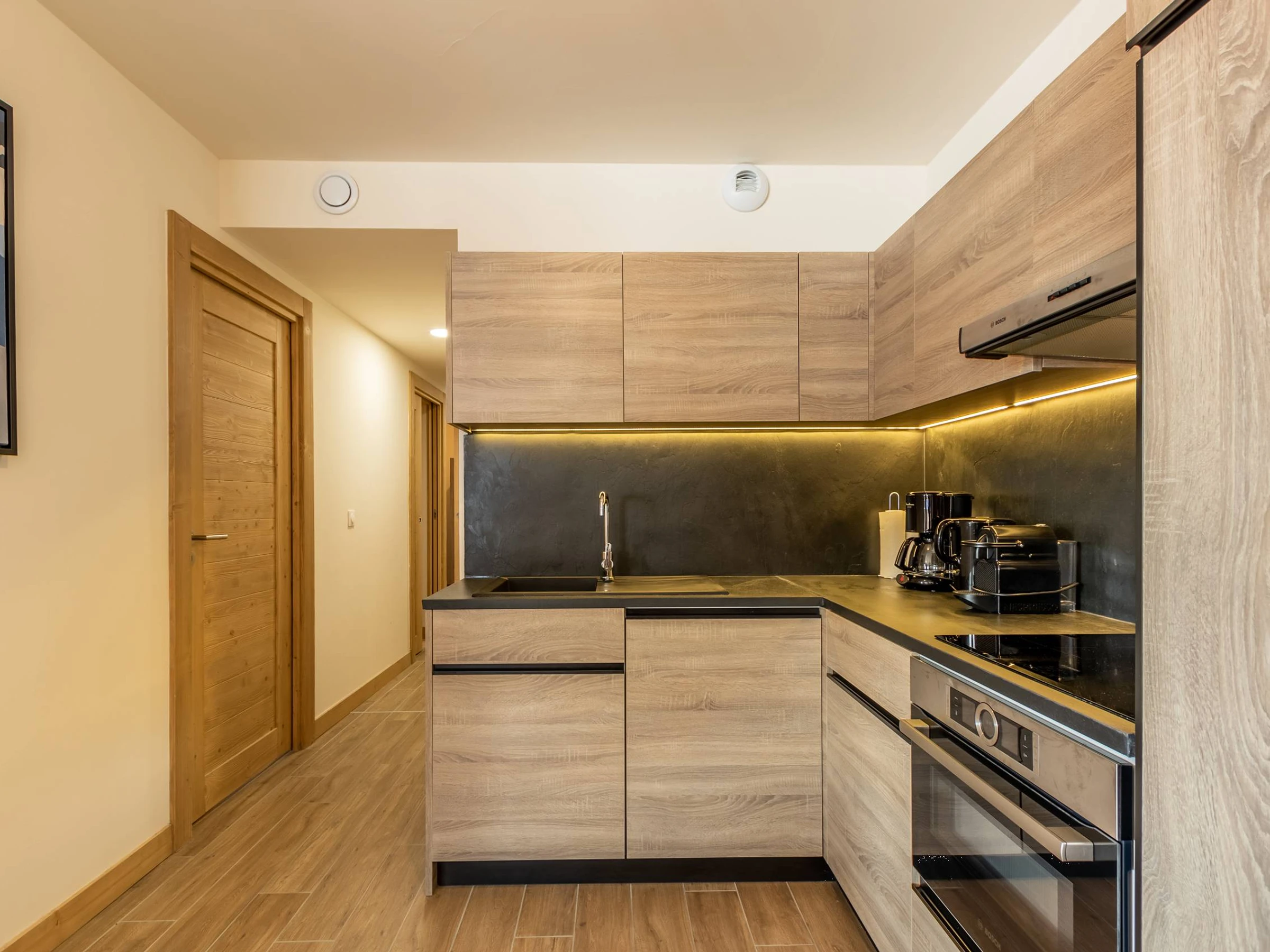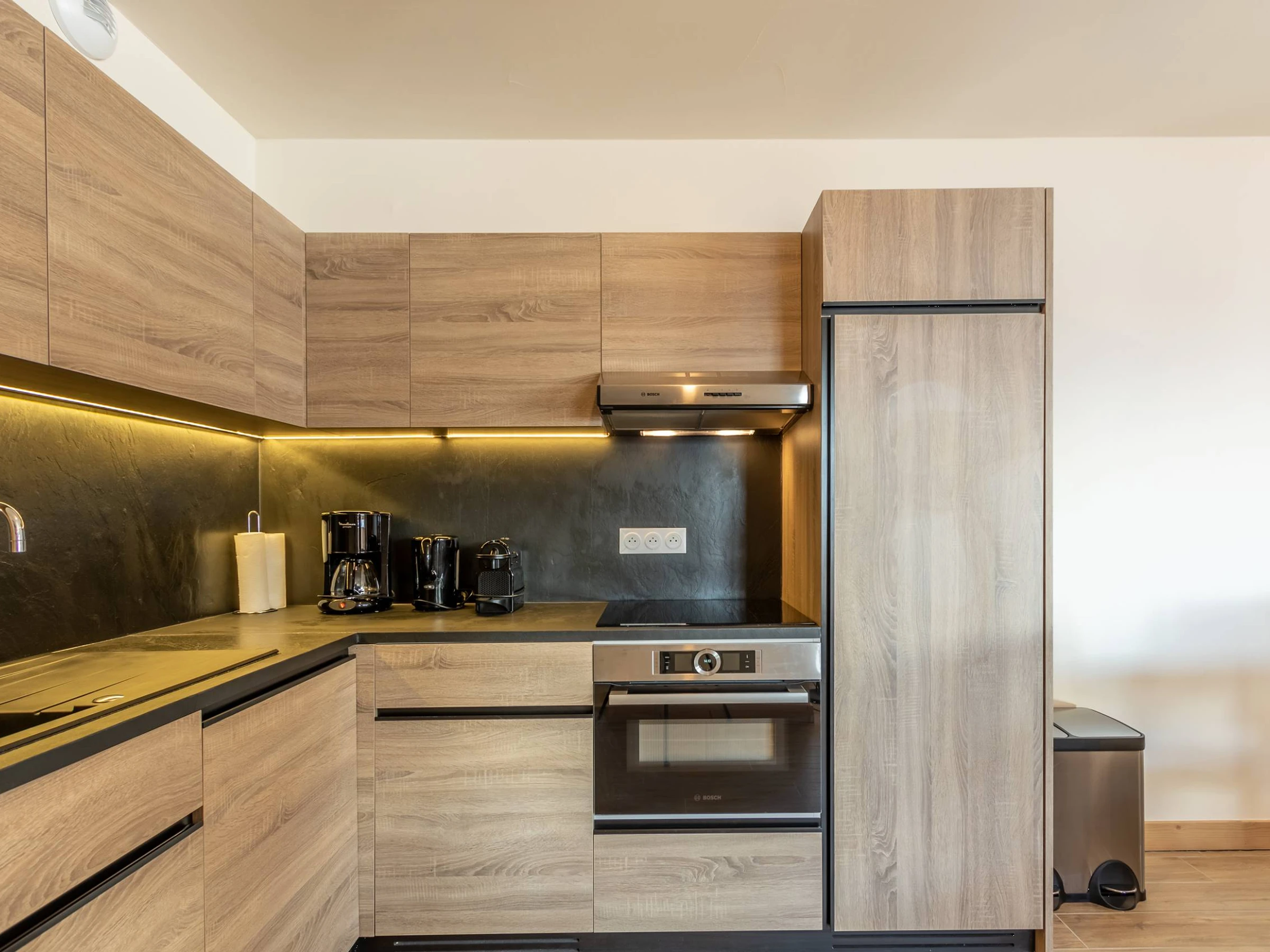 - 1 cuisine ouverte sur le séjour avec bar (plaques induction - lave-vaisselle - four/micro-ondes combiné - réfrigérateur - cafetière filtre - cafetière Nespresso - bouilloire - grille-pain, appareil à raclette et fondue),
