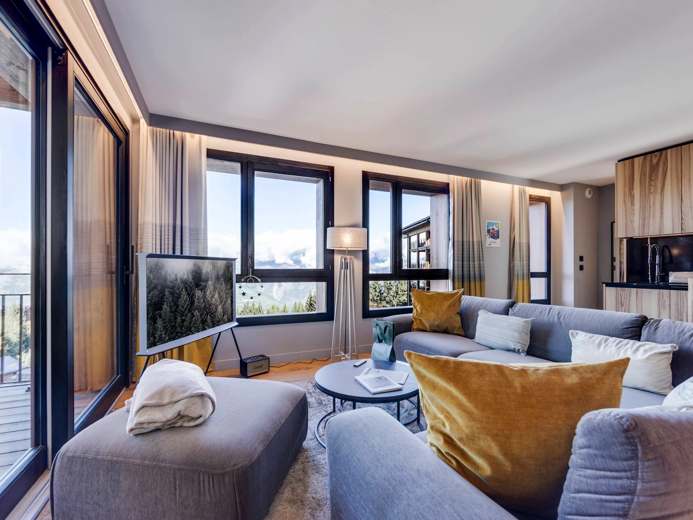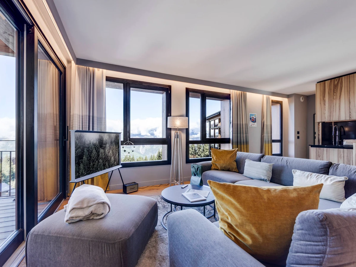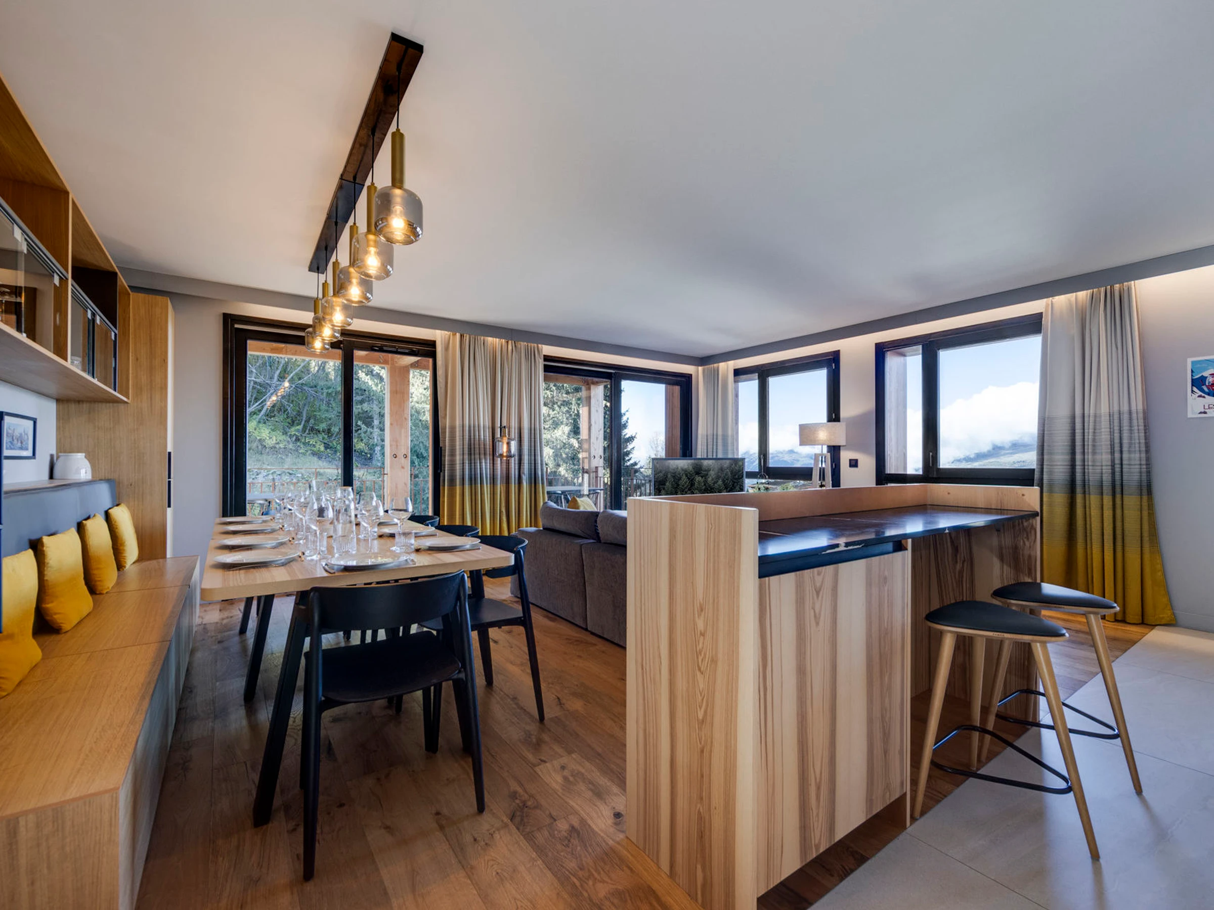 Appartement B10 en duplex dans la résidence Les Cristaux d'une superficie de 112m², dans le quartier du Chantel à Arc 1800, à côté des commerces et au pied des pistes. Il est équipé de 4 chambres et peut accueillir 8 adultes.