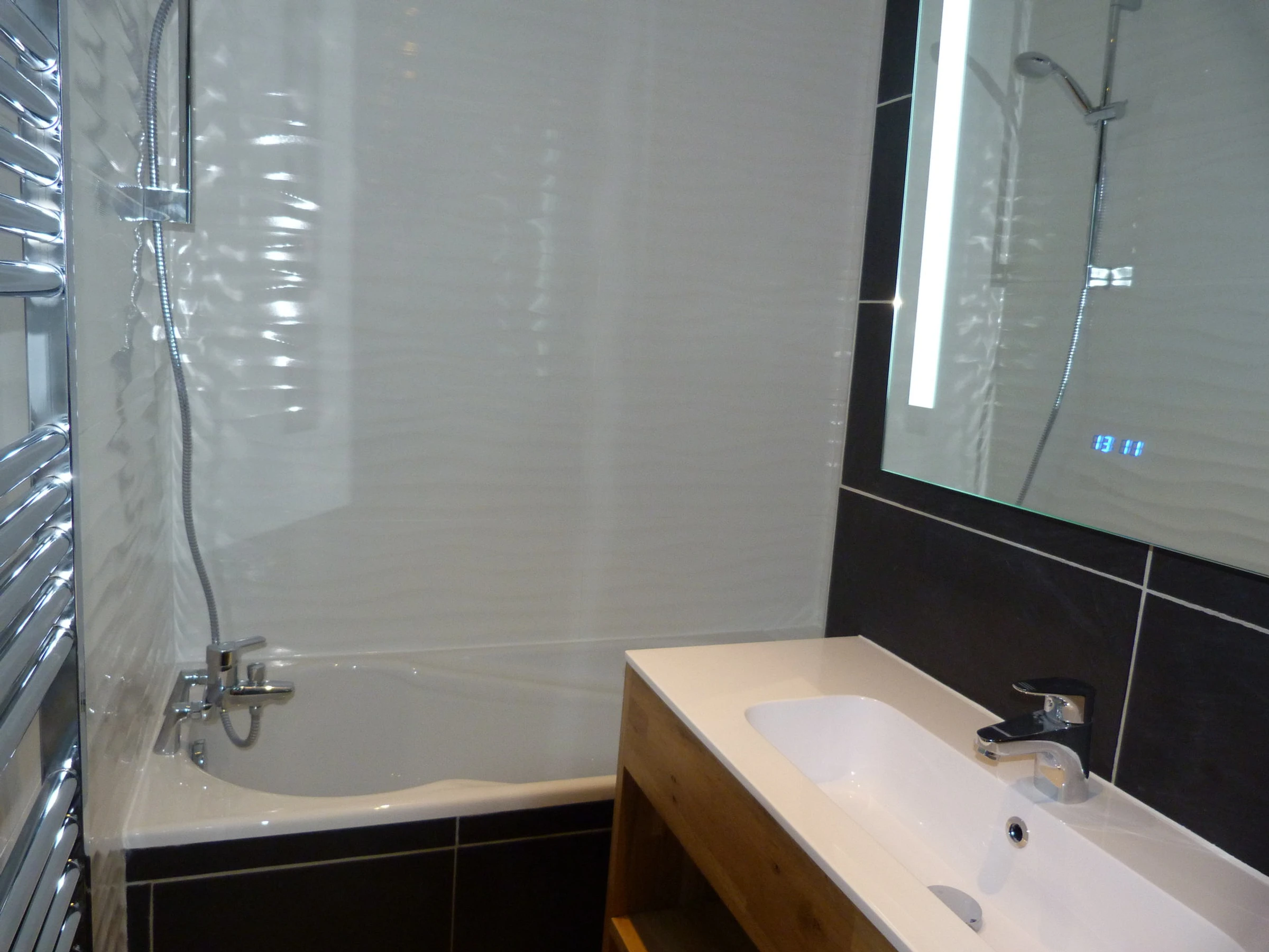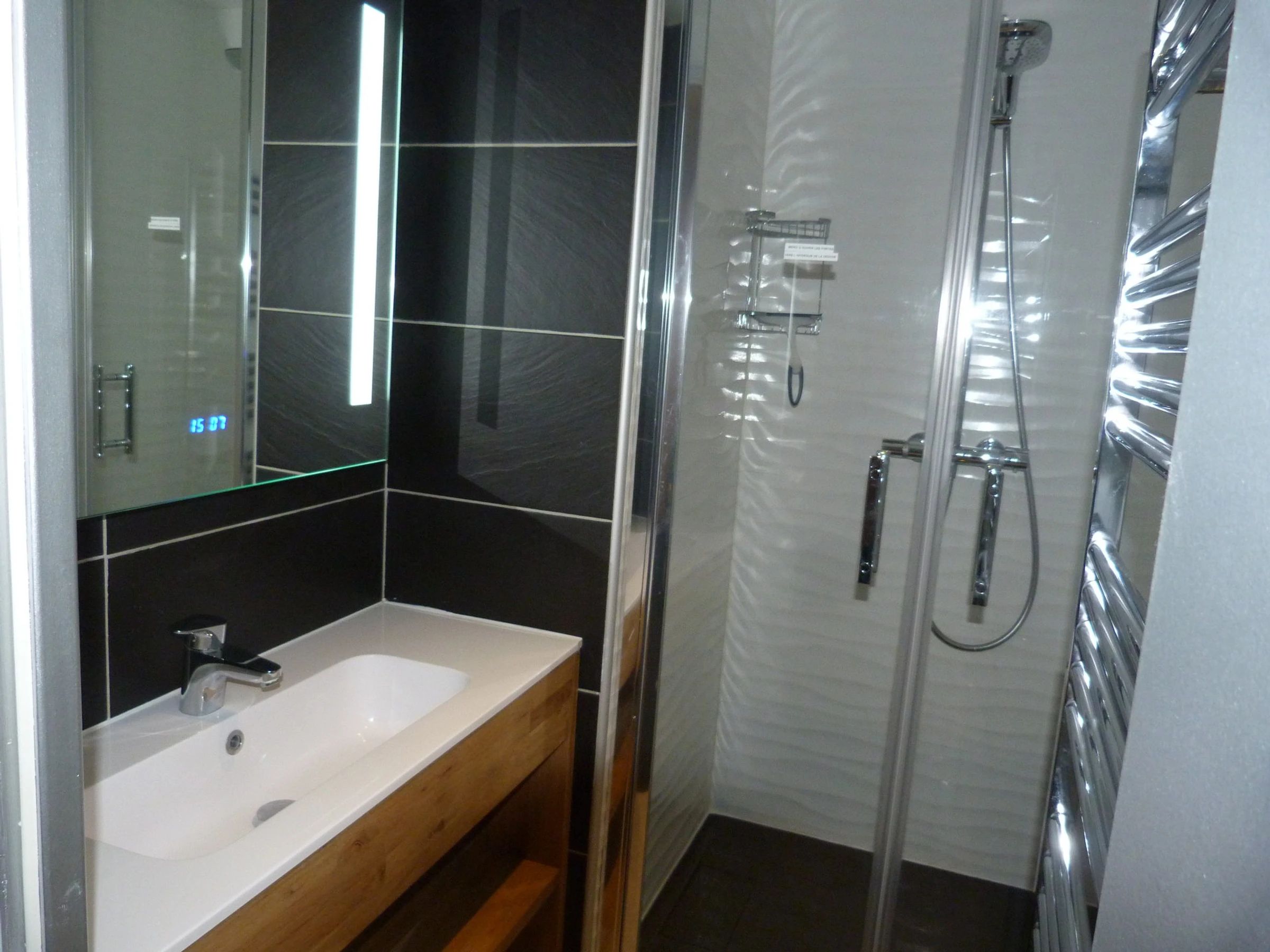 A l'étage inférieur : une salle de bains avec baignoire, une salle de douche et un second WC séparé.