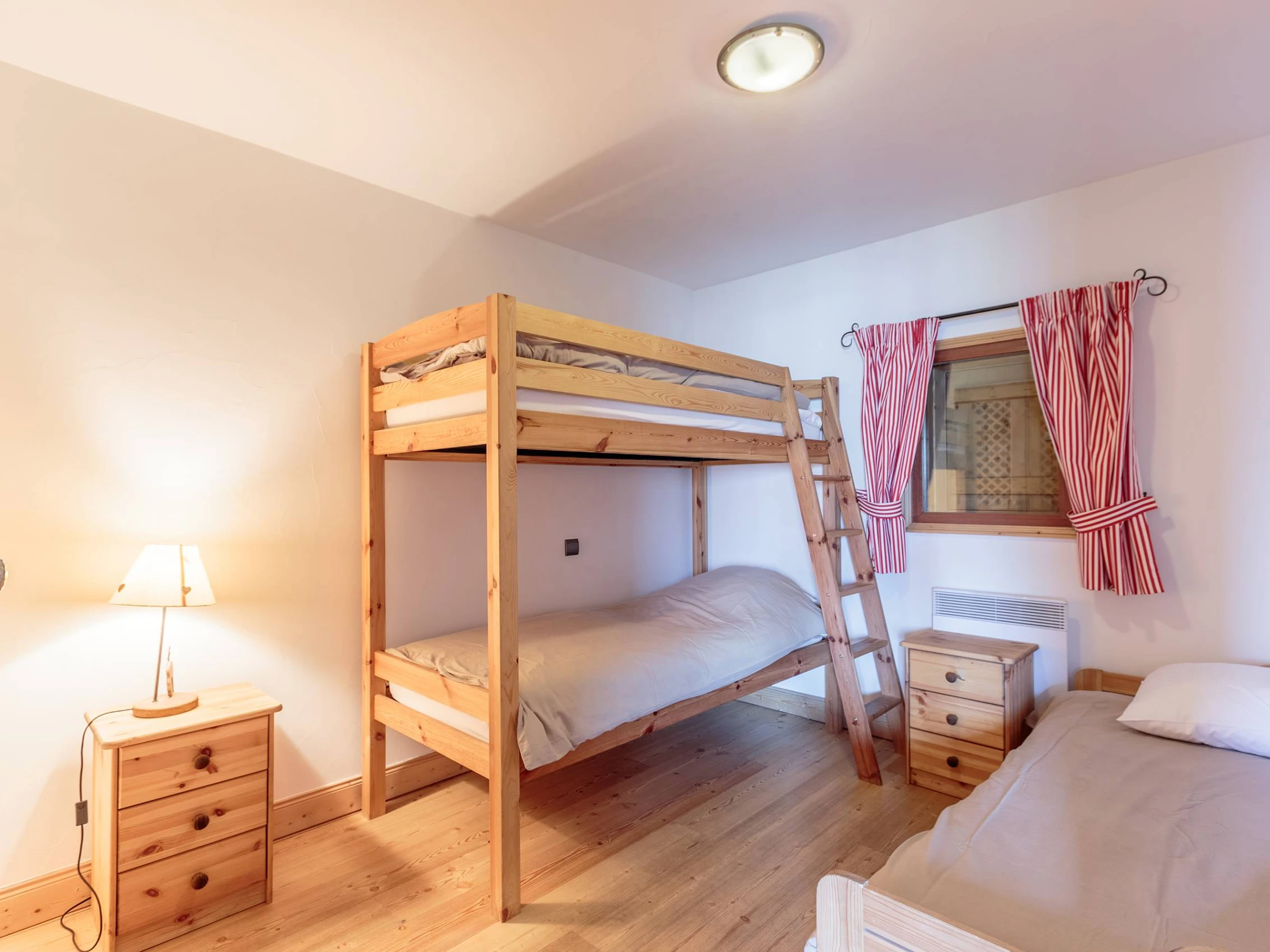 - Chambre 3 : lits superposés (80x190 cm) + 1 lit (80x190 cm) et lit gigogne (80x190 cm) + rangements (fenêtre condamnée car donnant sur couloir de la résidence)