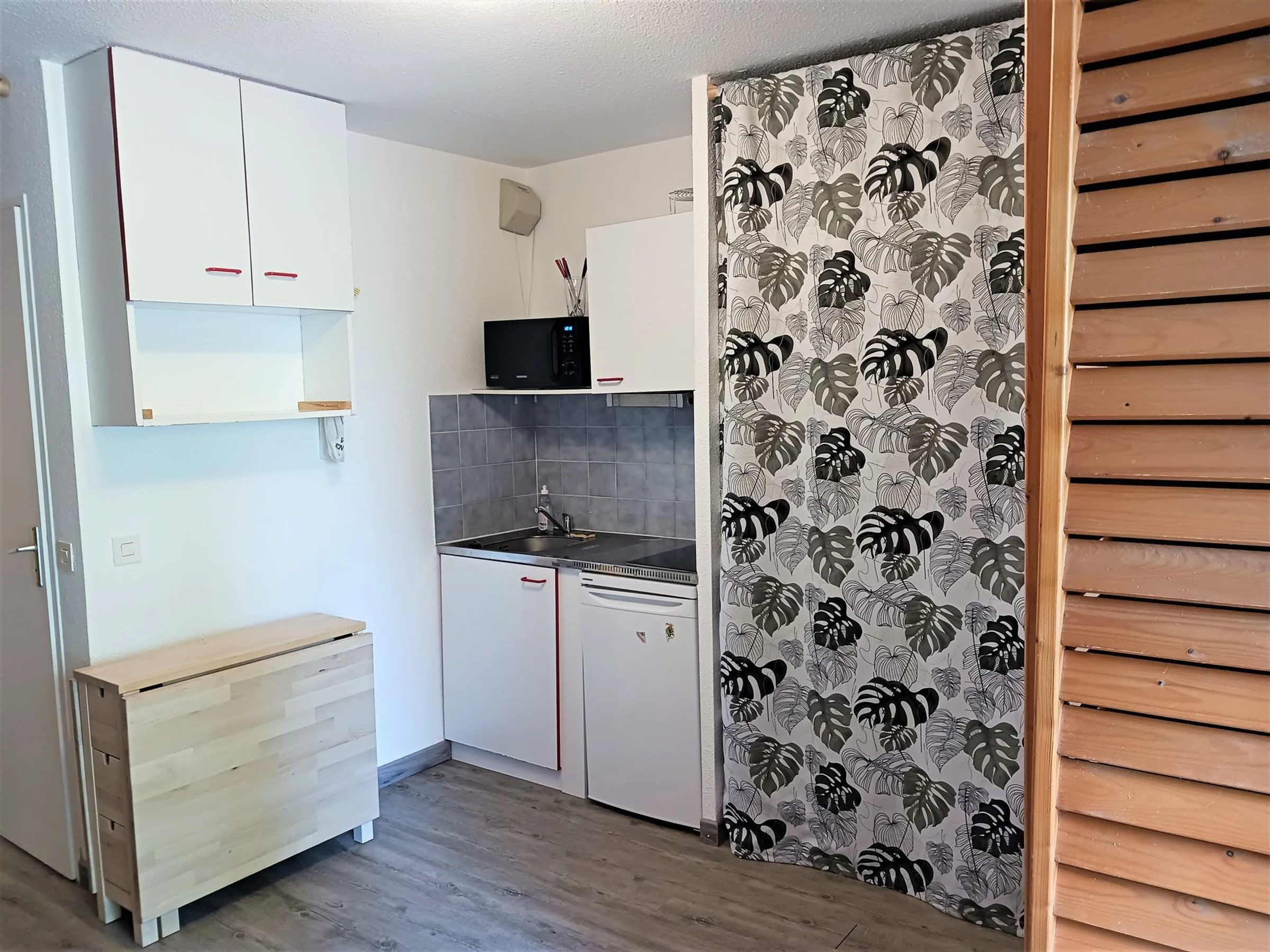 Il est équipé d'une plaque à induction, d'un combiné four/micro ondes et d'un réfrigérateur