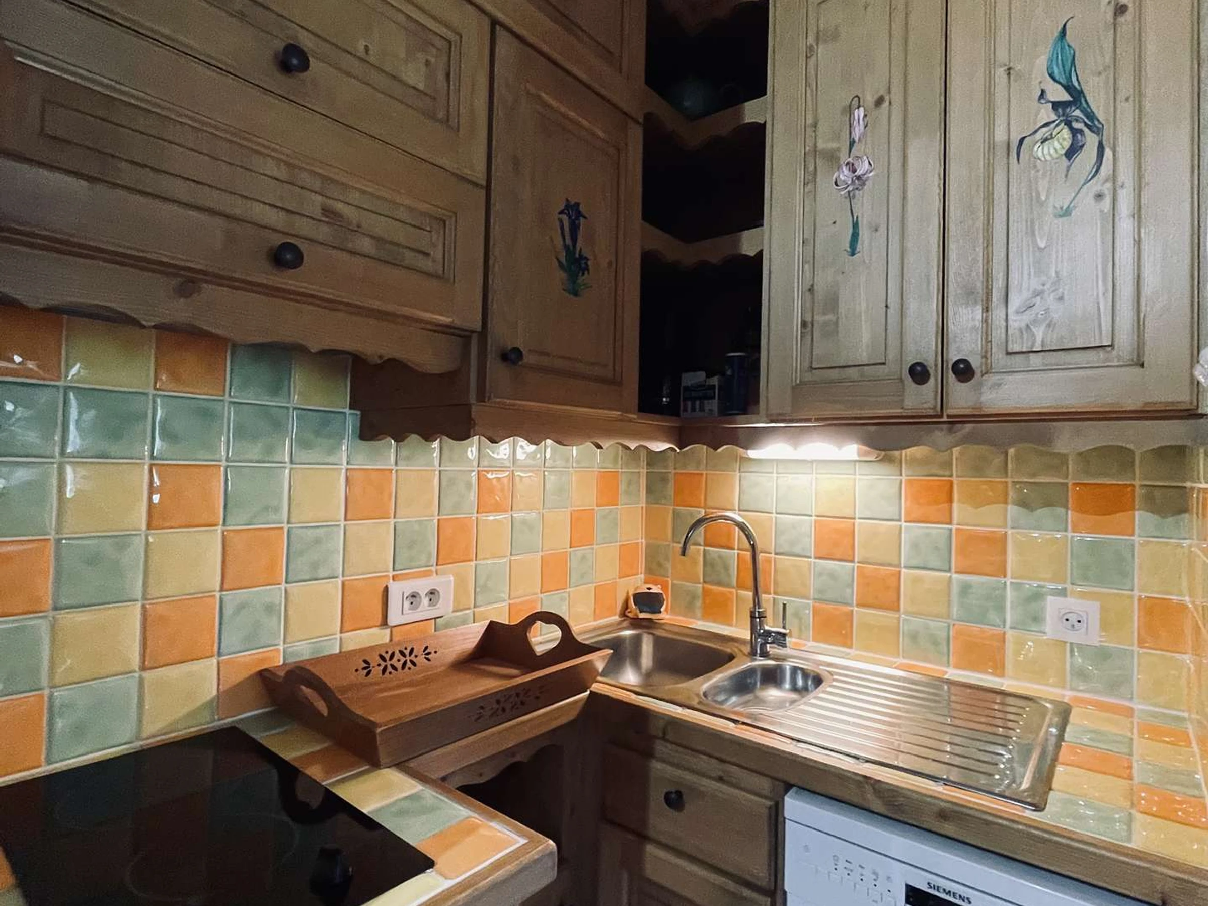 - Une cuisine avec évier, plaques de cuisson, four micro-ondes, lave vaisselle, appareil à raclette et fondue, cafetière, ustensiles de cuisine,