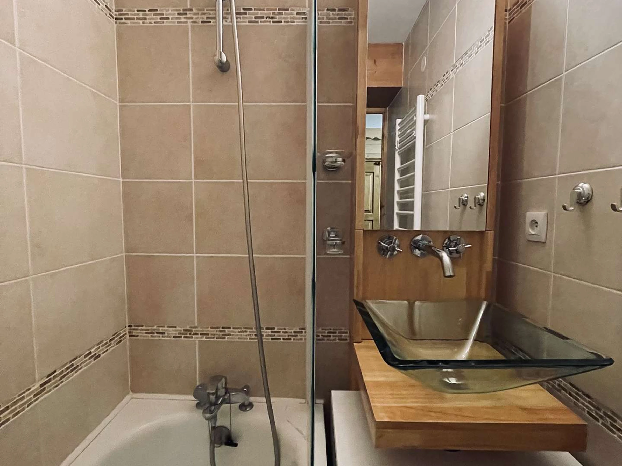 - Une salle de bain avec baignoire et pommeau de douche, un lavabo et un wc séparé,