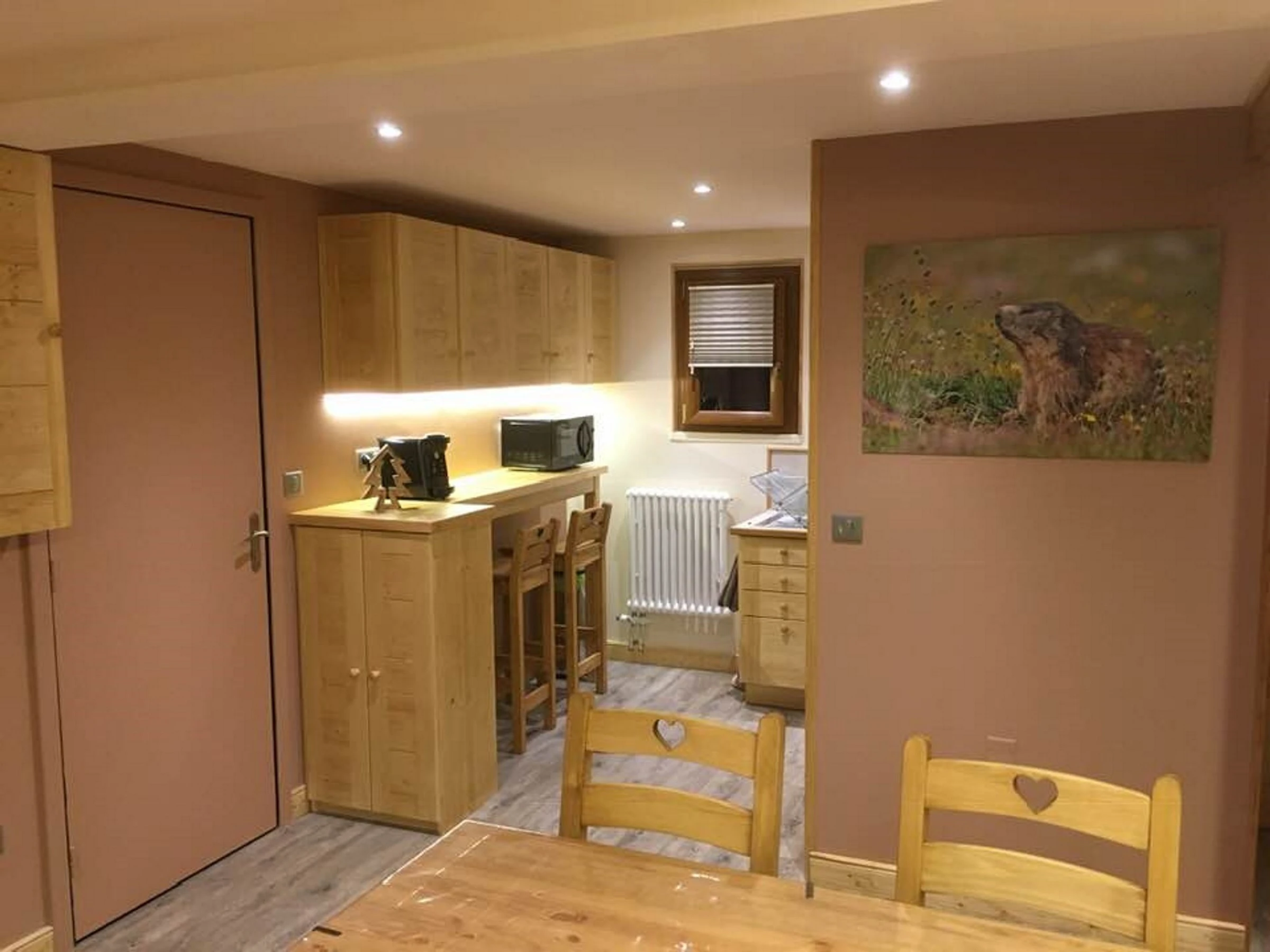 Cuisine équipée ouverte sur séjour, 4 Plaques vitrocéramiques, Cafetière à filtre, Cafetière TASSIMO, Lave-vaisselle, Appareil à fondue, Réfrigérateur taille moyenne avec partie congélateur, Bouilloire électrique, Micro-ondes, Four encastrable, Appareil à raclette, Grille-pain