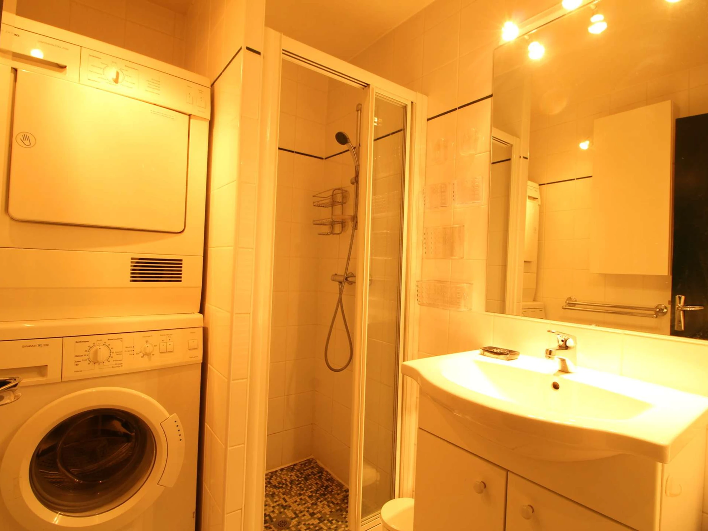 L’espace salon dispose d’un écran plat, d’un lecteur DVD et d’une connexion Wi-Fi. Un lave-linge et un sèche-linge complètent l’équipement.