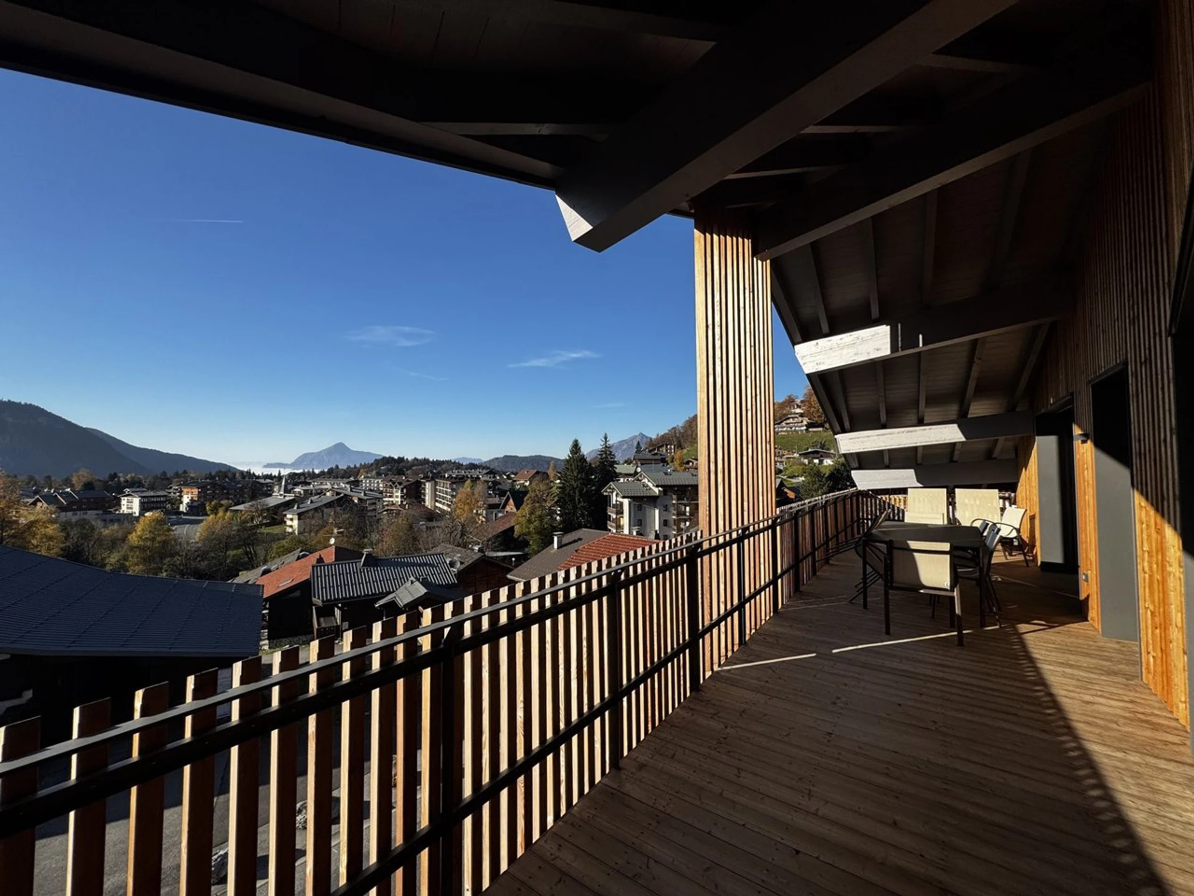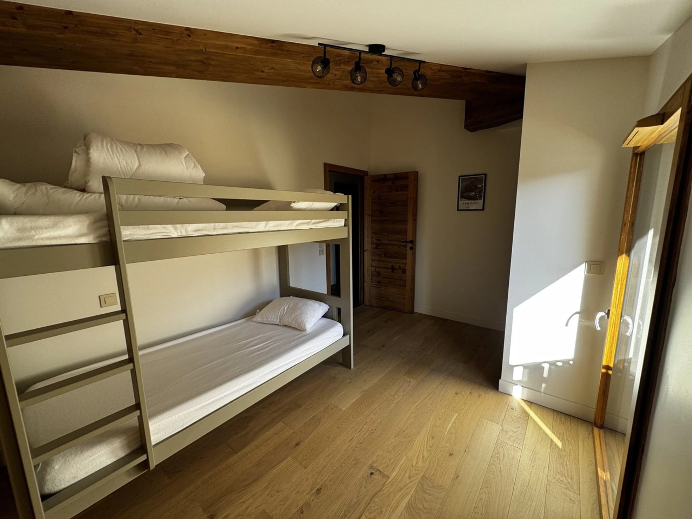 L’appartement, situé au 2e étage avec ascenseur, dispose d’un spacieux séjour ouvrant sur un grand balcon avec une vue imprenable sur les montagnes. Il se compose de quatre chambres : deux chambres doubles avec salle de douche privative et WC, une chambre avec deux lits simples, ainsi qu’une chambre équipée de lits superposés (le couchage en hauteur est déconseillé aux enfants de moins de six ans). Une salle de bains supplémentaire et un WC indépendant complètent les installations sanitaires.