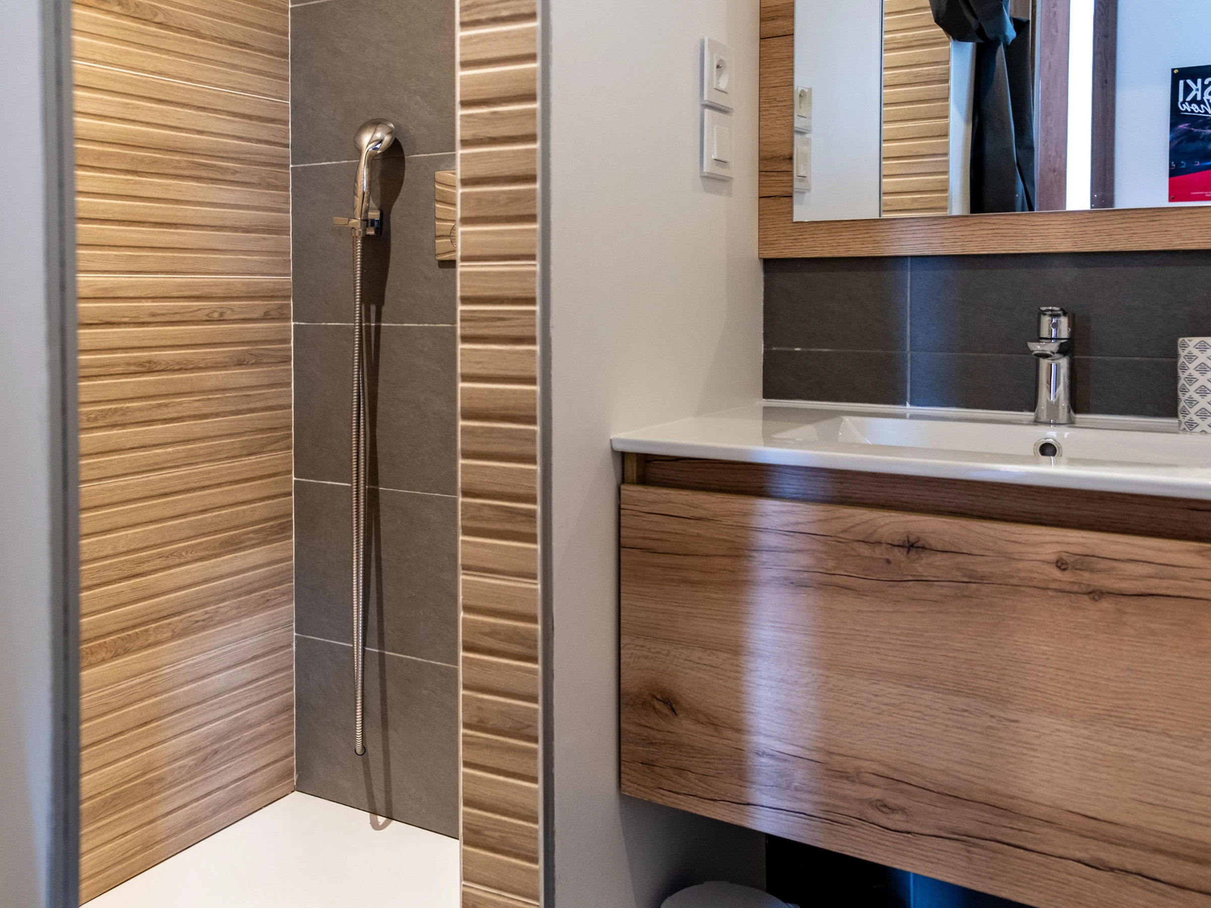 Salle de douche avec grande douche à l'italienne et lavabo.