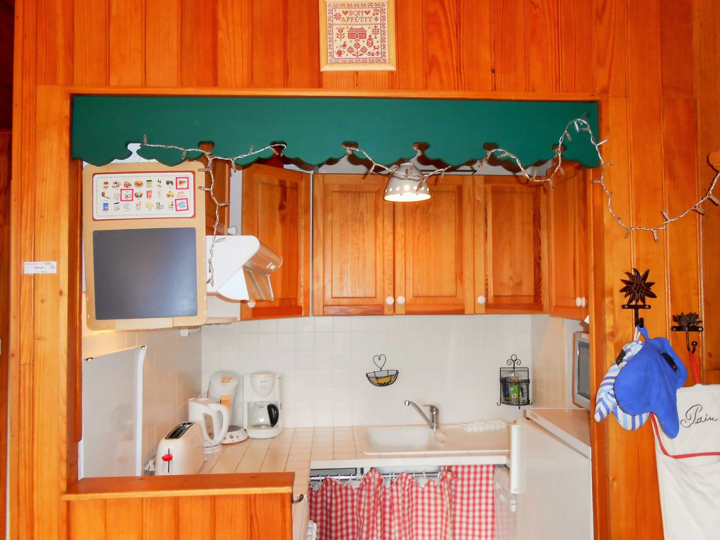 Equipements : Gazinière électrique avec four et 4 plaques électriques, micro-onde, réfrigérateur, lave-vaisselle, cafetière, bouilloire, grille-pain, appareil à raclette, appareil à fondu.
