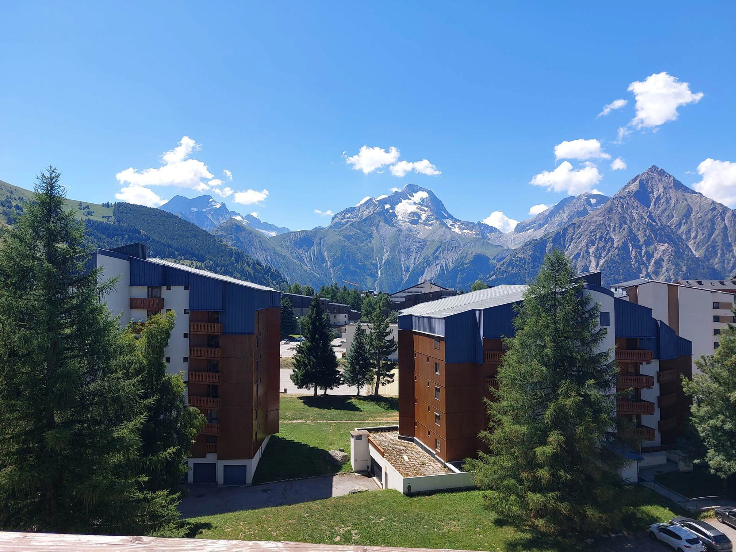 Balcon exposé sud, avec vue dégagée sur les montagnes et sur les pistes.
