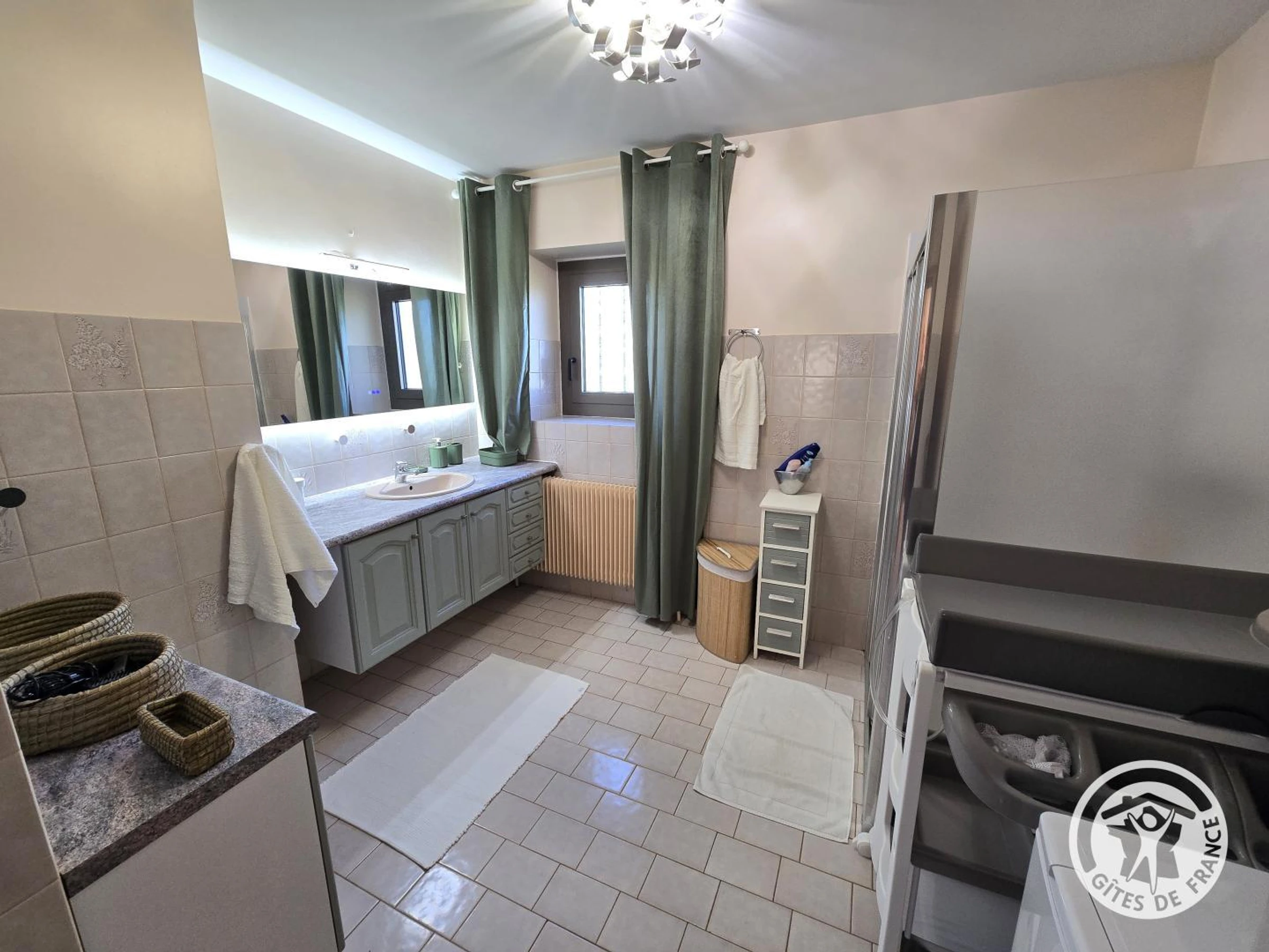 Maison de plain pied pour 6 personnes avec une grande pièce à vivre son grand salon canapé d'angle télévision, wifi et son espace salle à manger. Une cuisine indépendante toute équipée. Une grande salle d'eau avec douche, meuble vasque, table à langer baignoire pour enfant et lave-linge. WC indépendants avec lave-mains. Une première chambre avec un lit en 160x200. Une deuxième avec deux lits en 90x200, et la dernière avec un lit en 140x190.