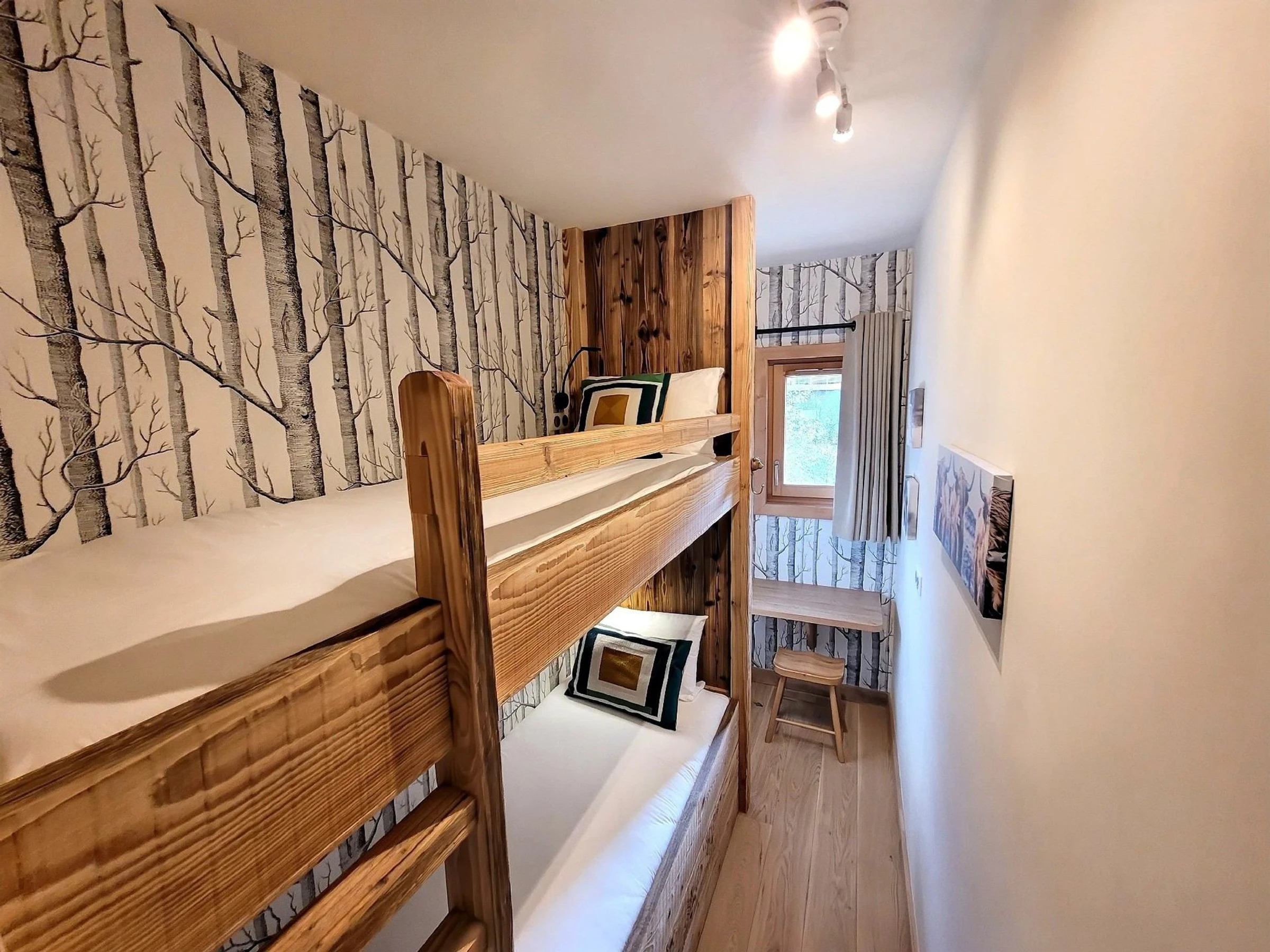 1 petite chambre cocooning avec fenêtre donnant sur jardin. Lits superposés (80x200cm). Placards intégrés