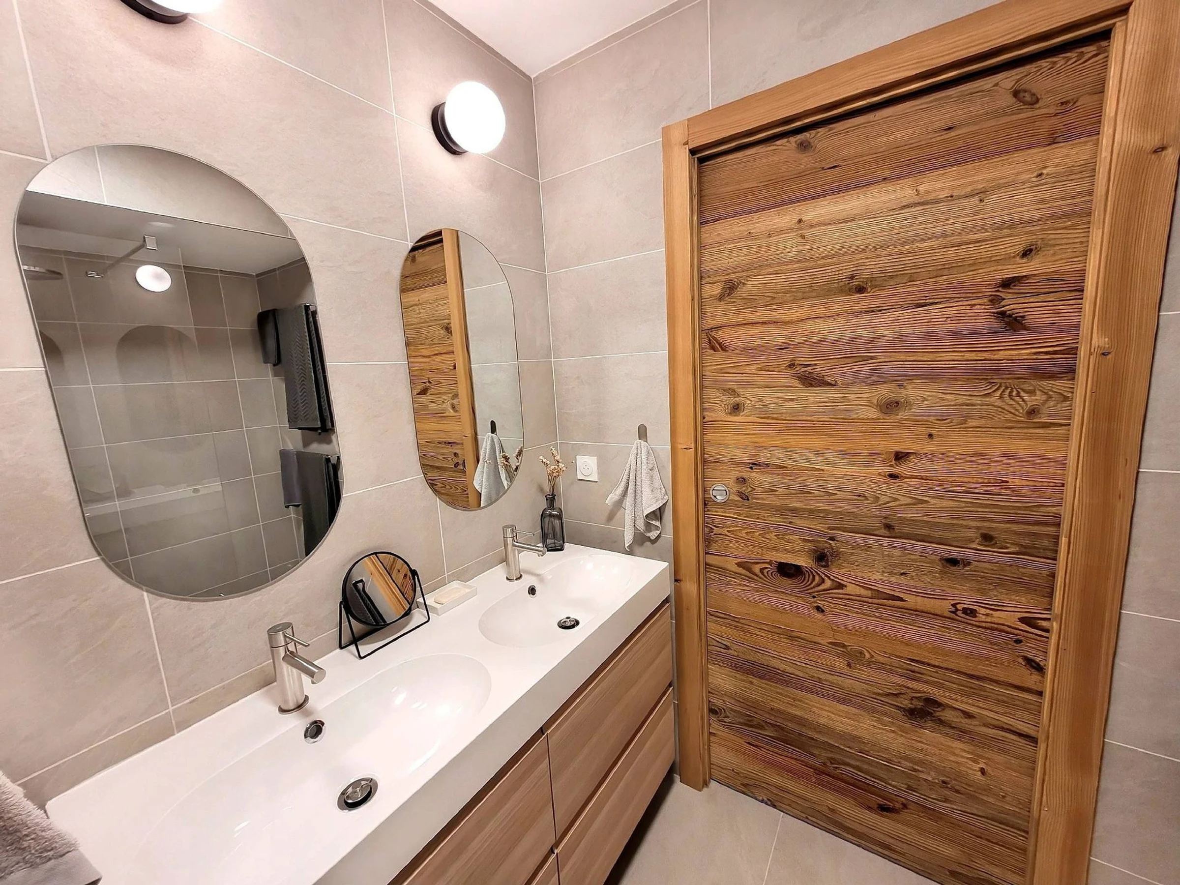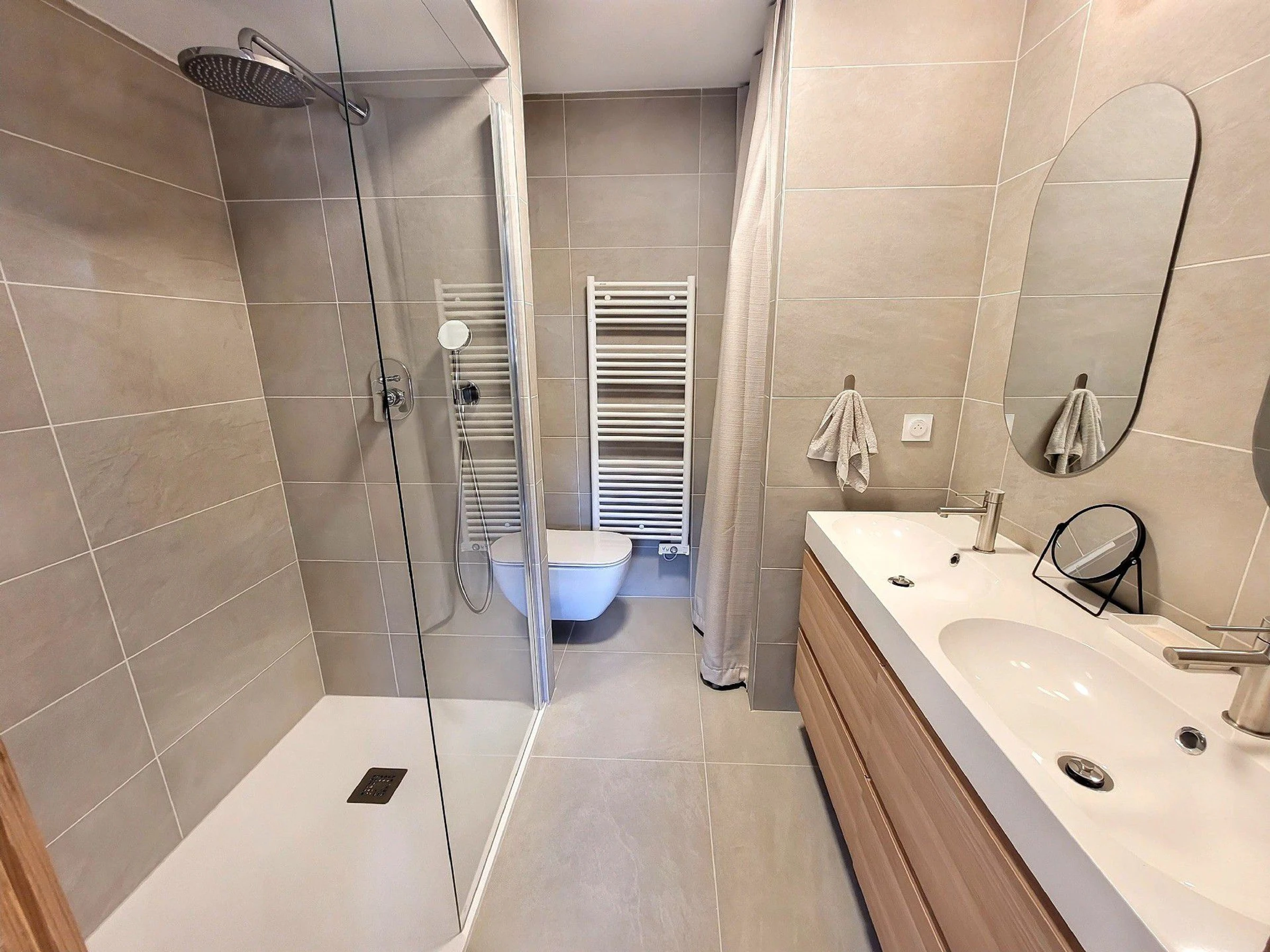 - Salle de douche avec sèche serviette, double vasque, wc, lave-linge et sèche-linge