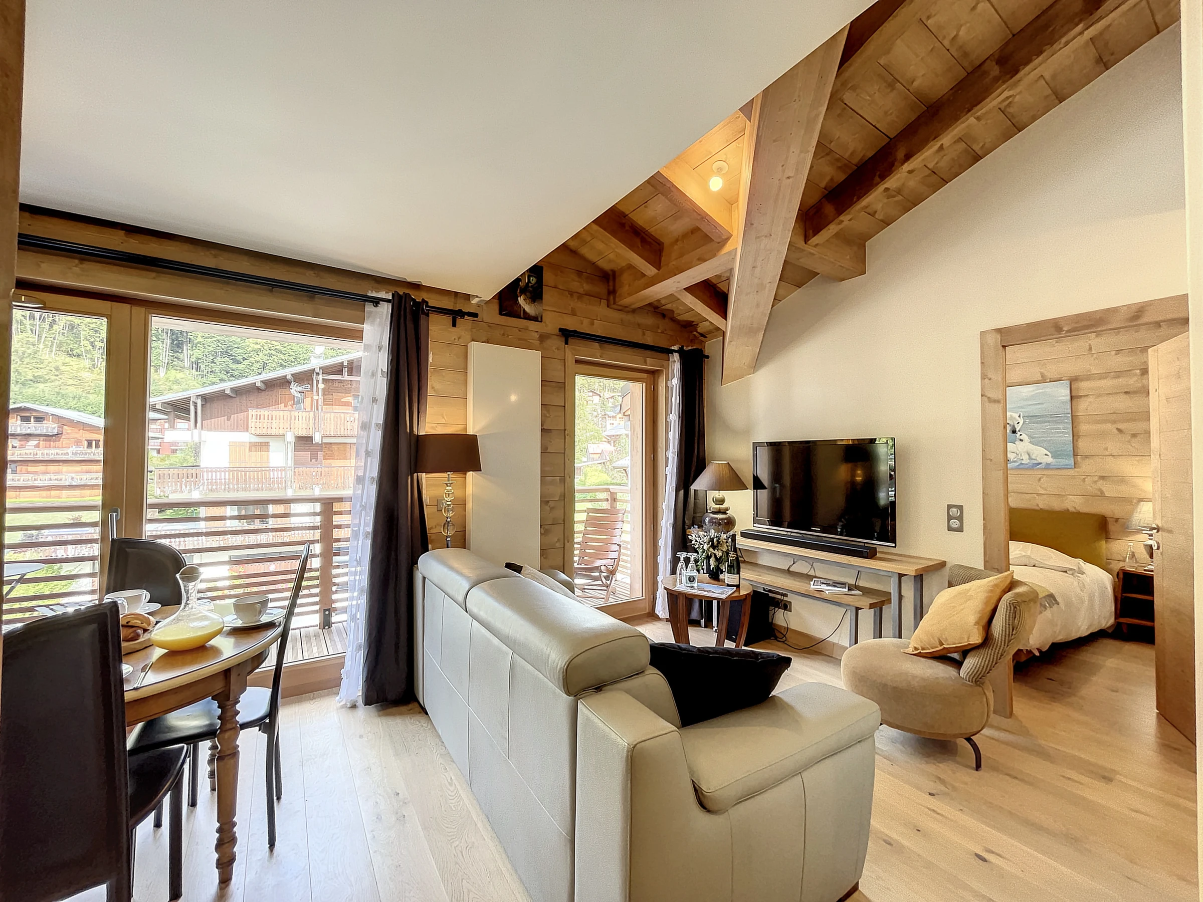 Dans la lignée des chalets haut-savoyards, cet appartement de standing allie avec élégance le charme authentique de la montagne à des éléments de modernité intemporelle, insufflant ainsi une ambiance chaleureuse et raffinée au cœur même du centre de la station des Gets.