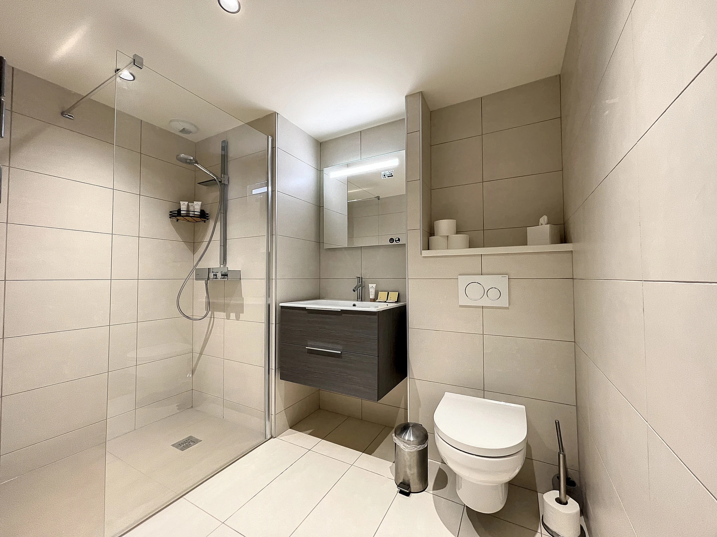 L'appartement comprend une chambre principale avec un lit double et un placard intégré, une chambre cabine avec un lit superposé, ainsi qu'une salle de bain fonctionnelle avec douche à l'italienne, lavabo simple vasque, sèche-serviette et WC. Un second WC séparé est également à disposition. Vous trouverez également un placard de rangement, une buanderie équipée d'une machine à laver, ajoutant ainsi de la praticité au bien.