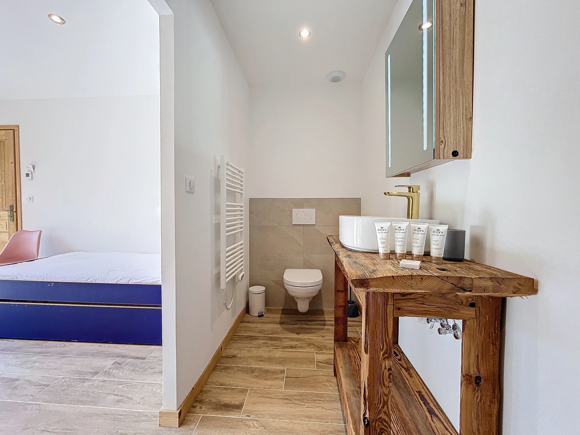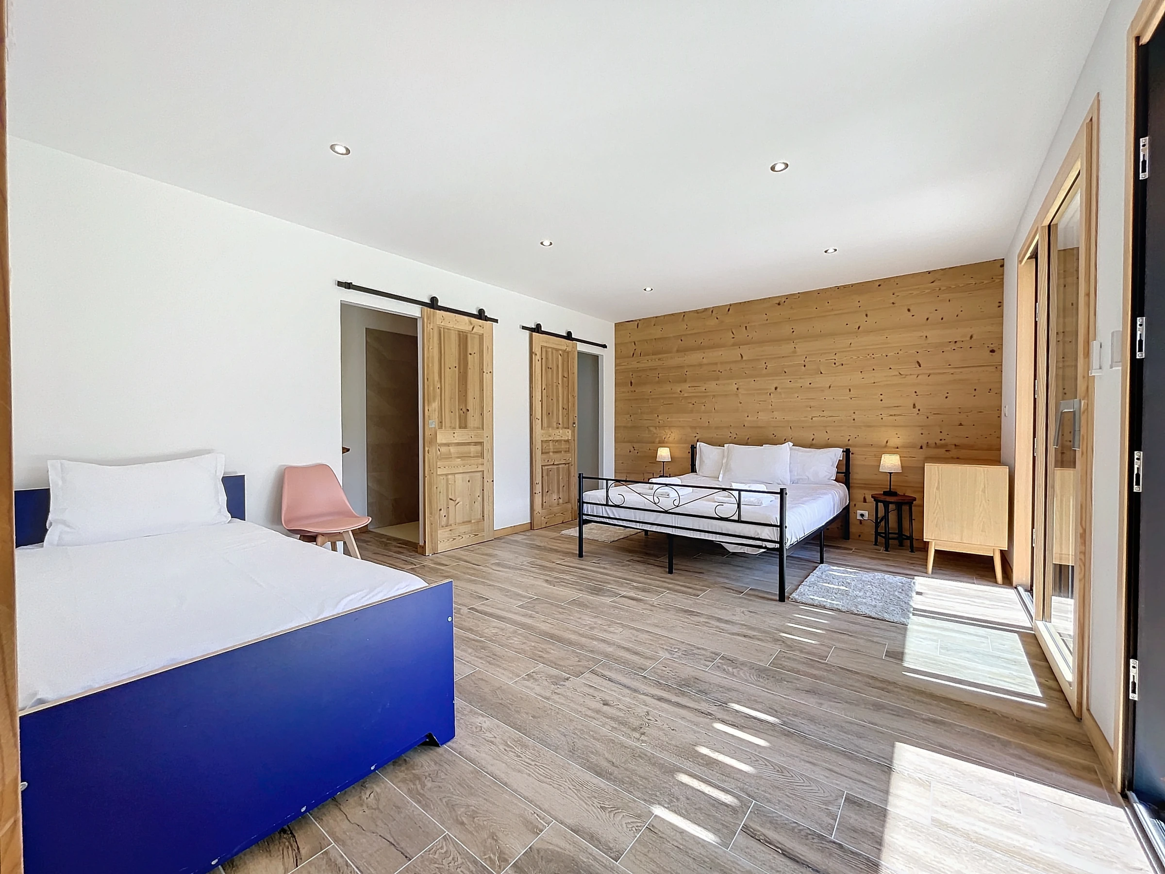 Au niveau inferieur, se trouve deux chambres en suite ouvertes sur la terrasse du bas. La plus grande des chambres possède un lit gigogne pouvant se déplier en deux lits simple. Chalet ayant une capacité maximum de 6 personnes