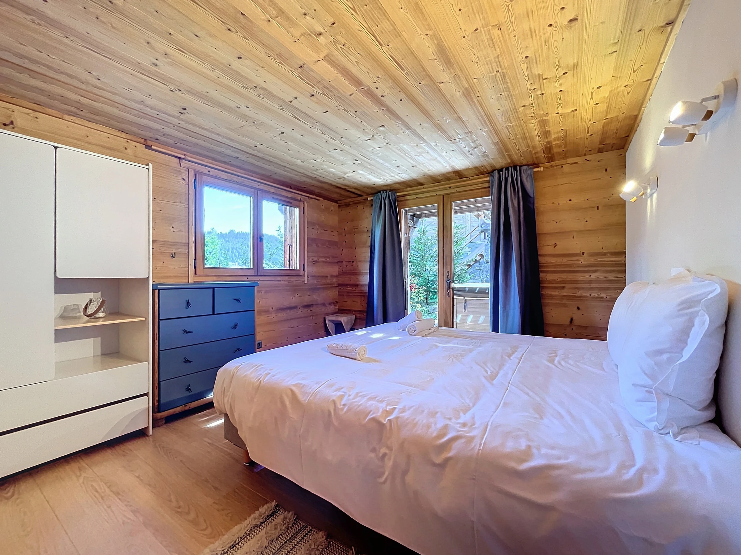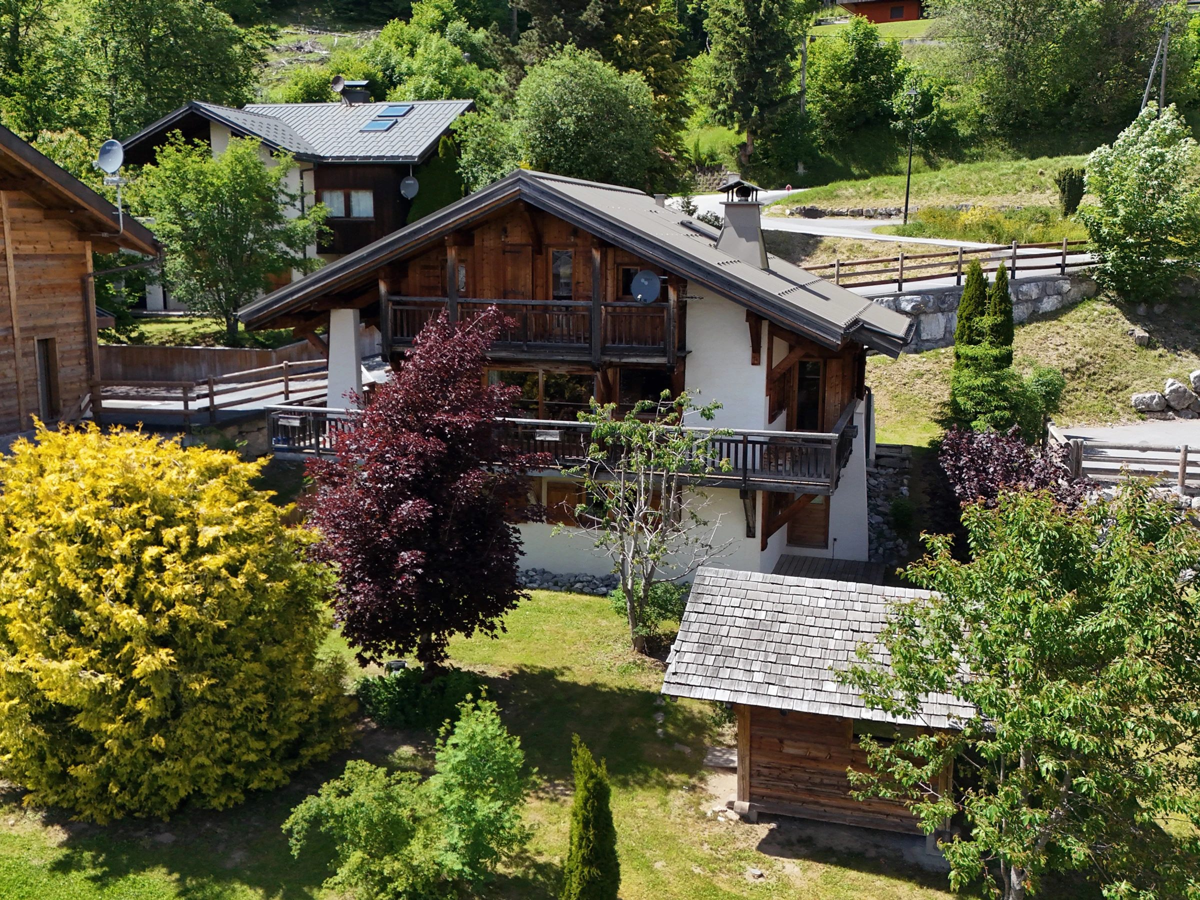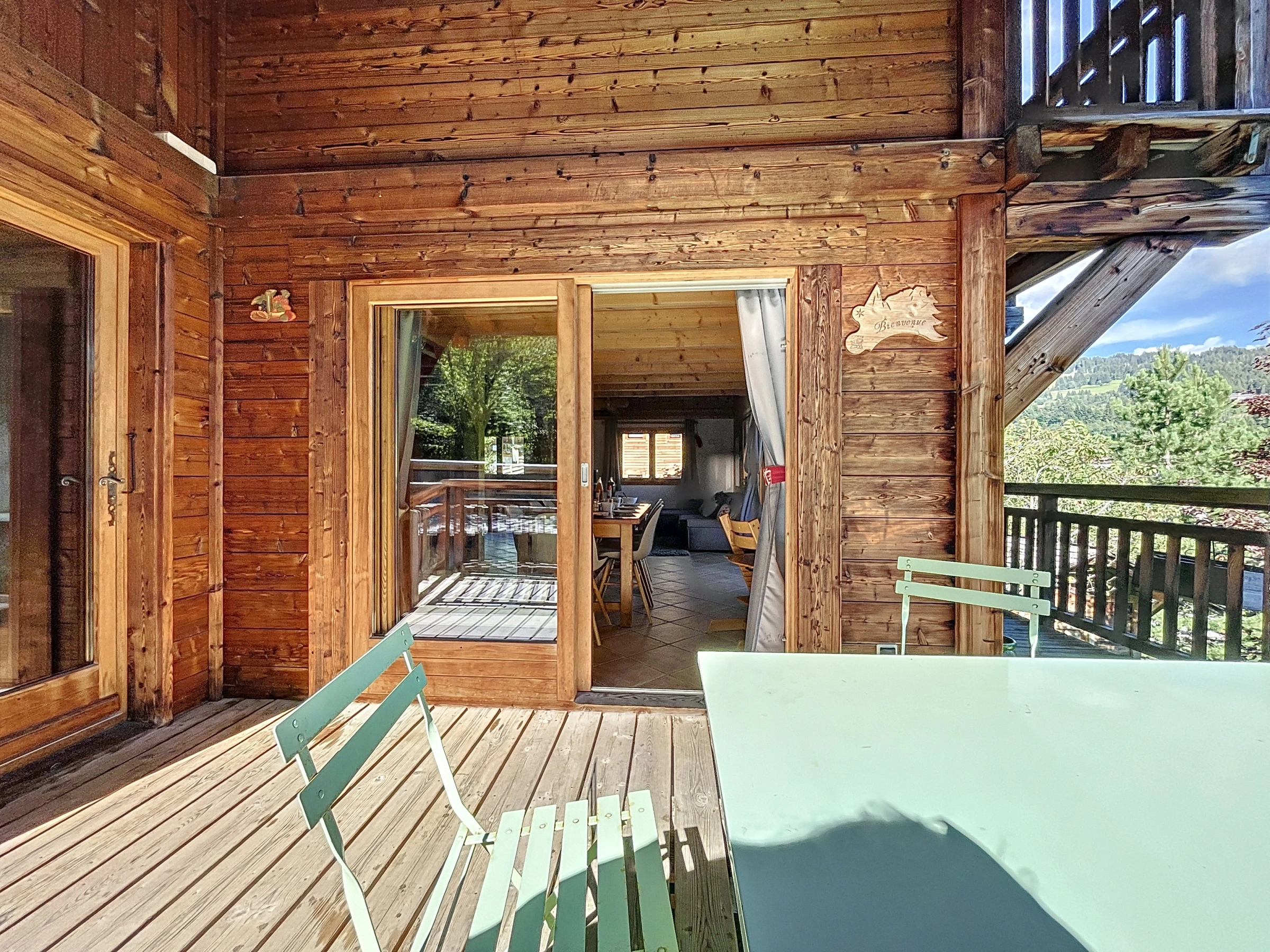 En extérieur, profitez pleinement de la terrasse pour partager vos repas. En contre-bas, détendez-vous et profitez du jardin privé équipée d'un jacuzzi et d'un sauna construit à l'intérieur d'une maison typique montagnarde, appelé "mazot".