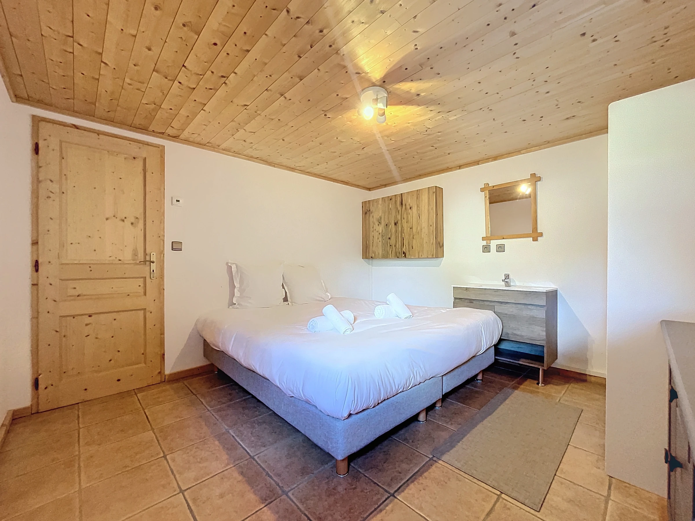 À l'étage, une mezzanine ouverte sur le séjour vous emmène à la chambre parentale équipée d'un lit double, ou deux lits simples selon vos besoins, avec accès sur le balcon. En face, la salle de bain et des toilettes séparés.