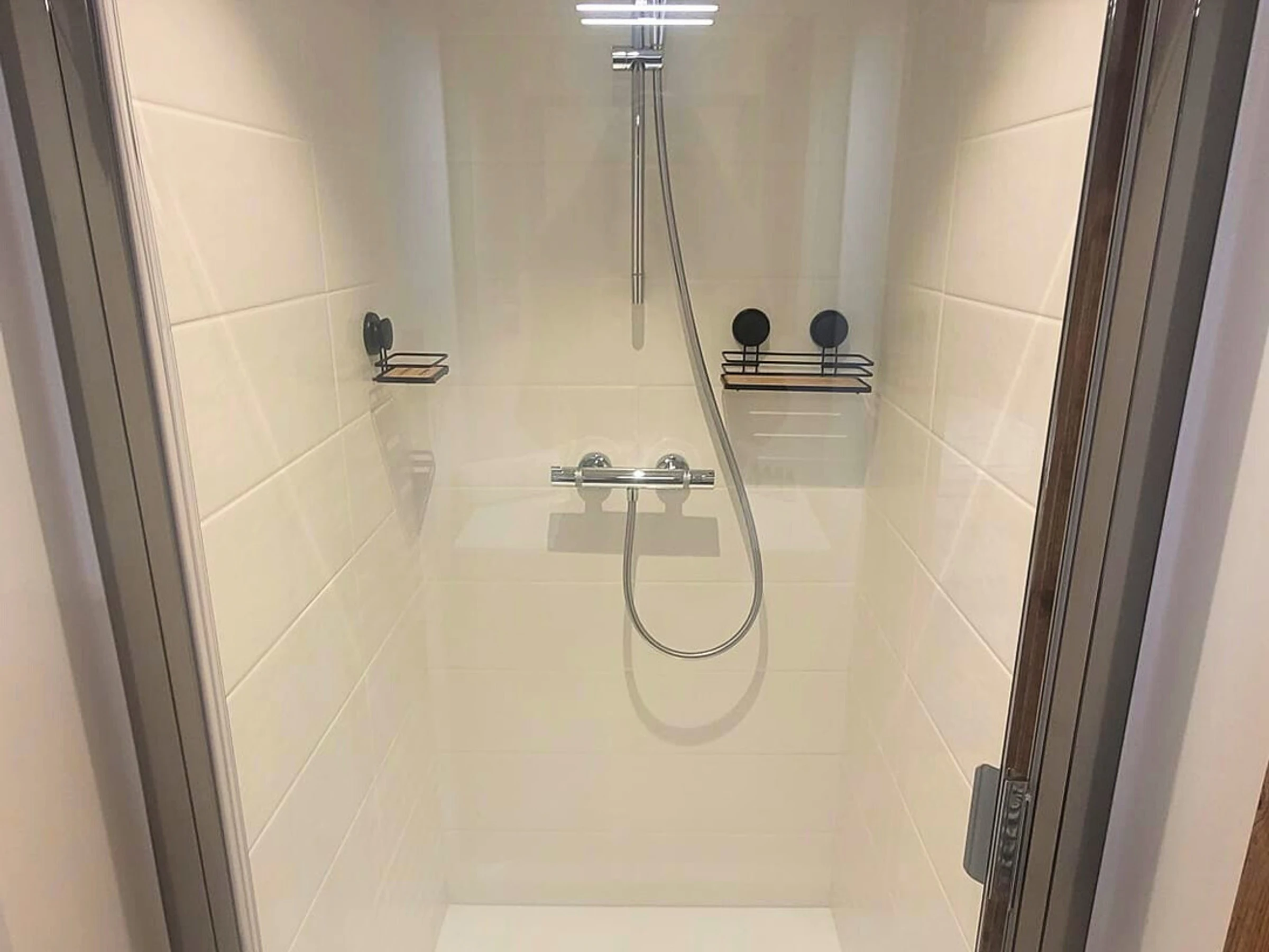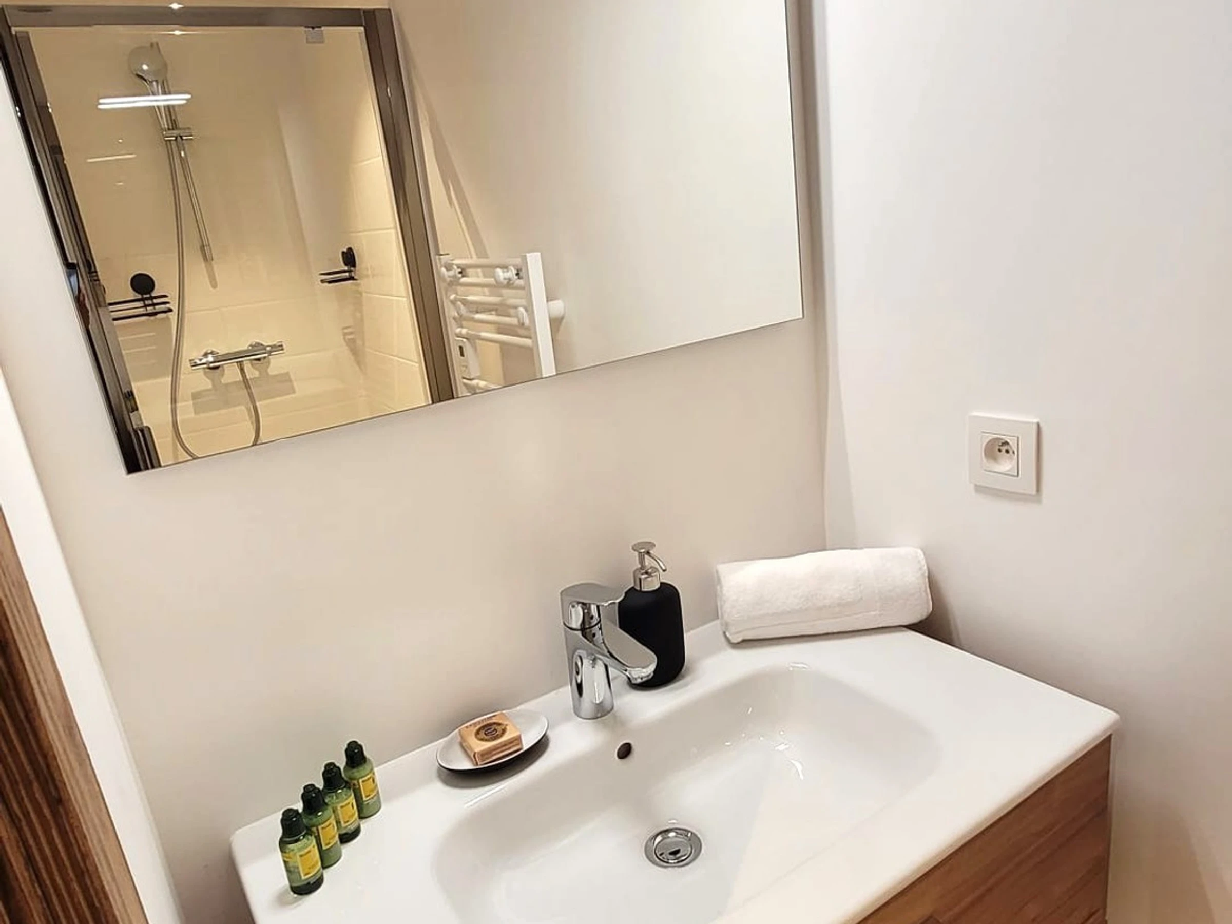 - Une salle de douche équipée d'une douche, d'un lavabo et d'un sèche serviette.
