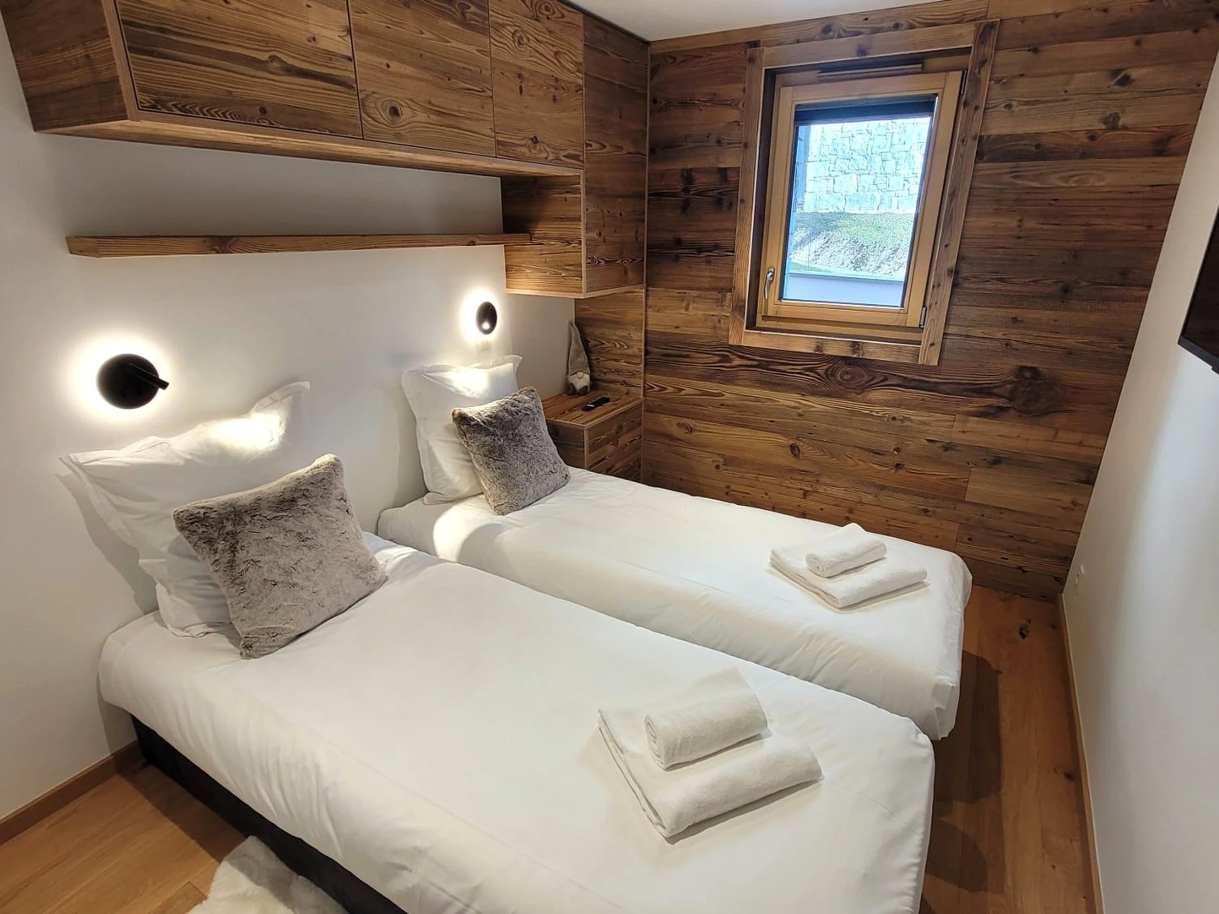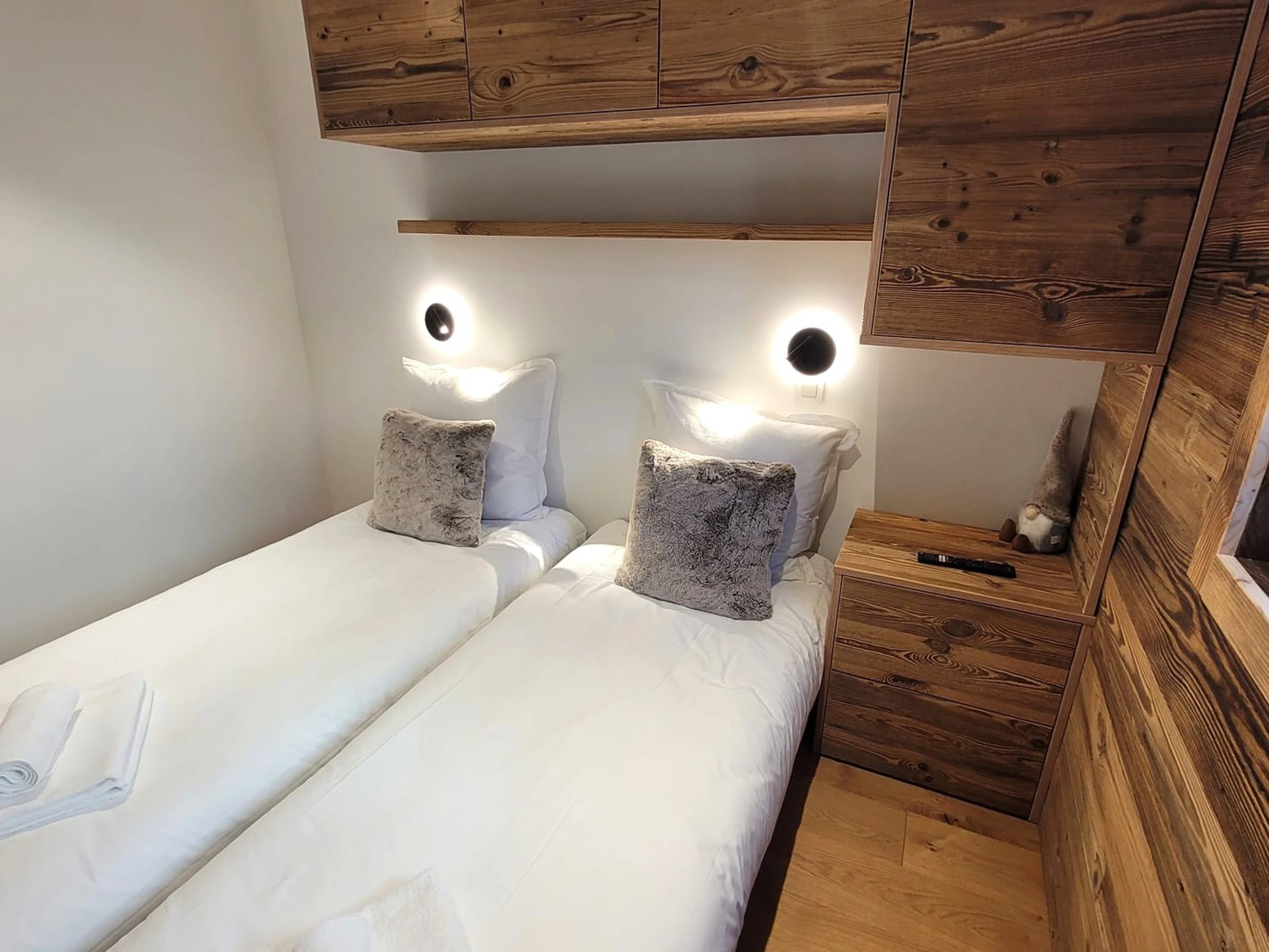 - Une chambre avec deux lits simples 80x190cm (pouvant former un lit double) avec des rangements et TV.