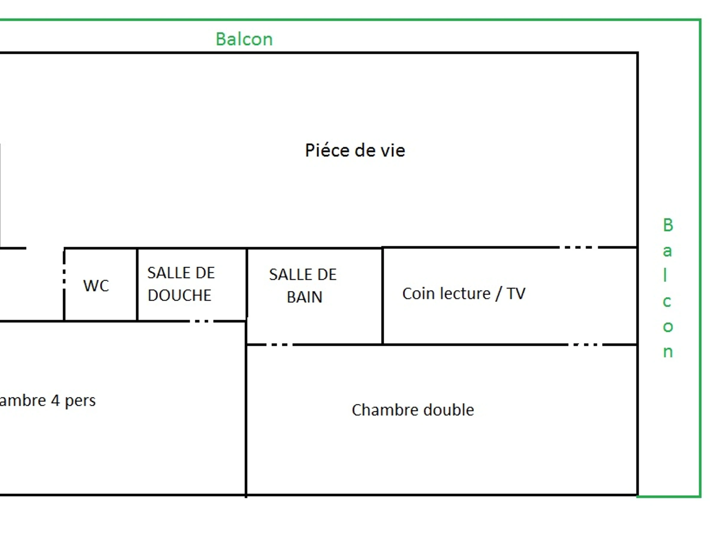 - 1 chambre double (160 x 200 cm) en suite, rangements, ouvrant sur un balcon exposée Sud: