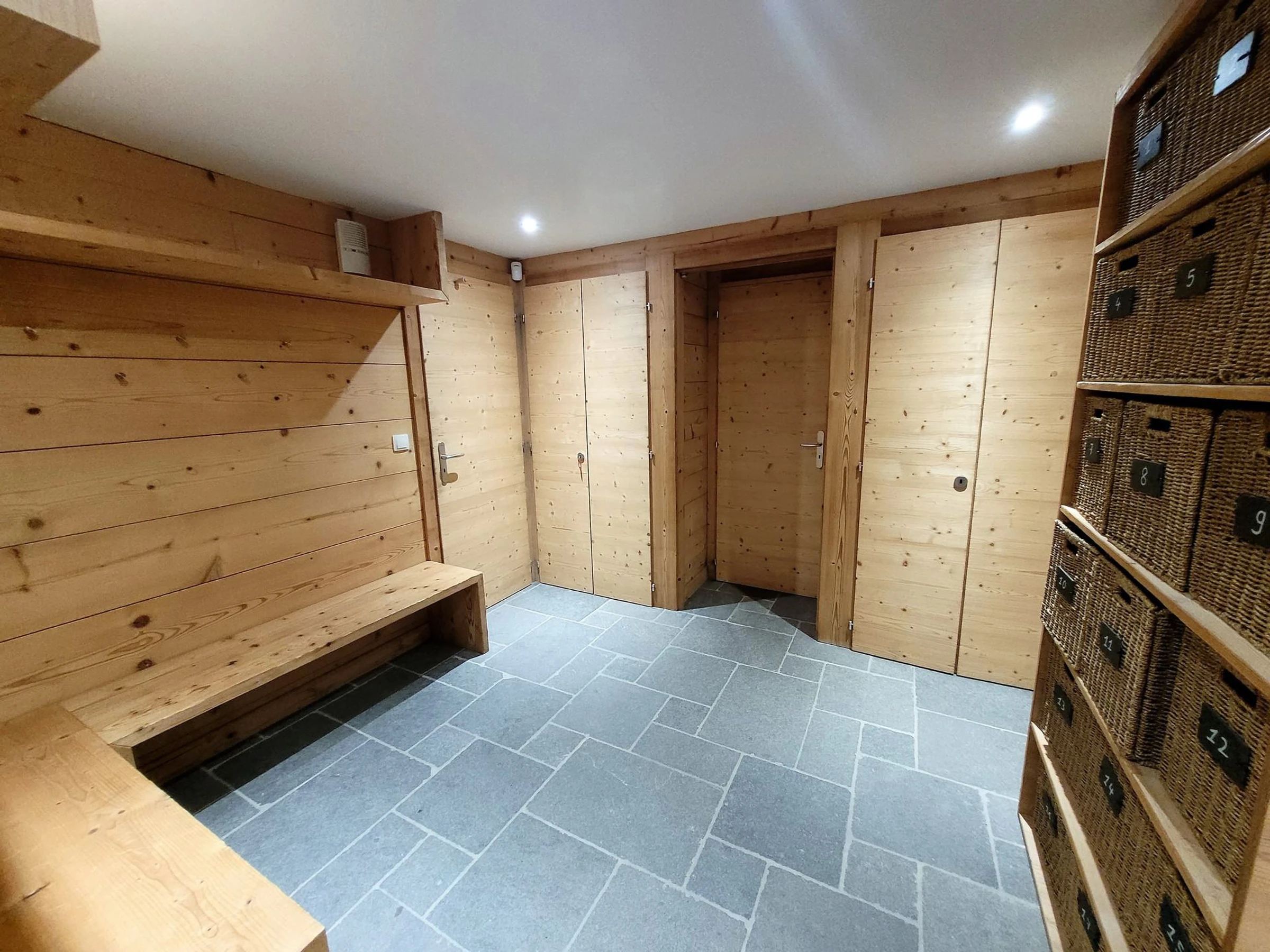 - 1 entrée équipée de bancs et patères, disposant d'un meuble avec 18 paniers individuels pour ranger vos petits équipements tels que gants, casques, lunettes et masques ....