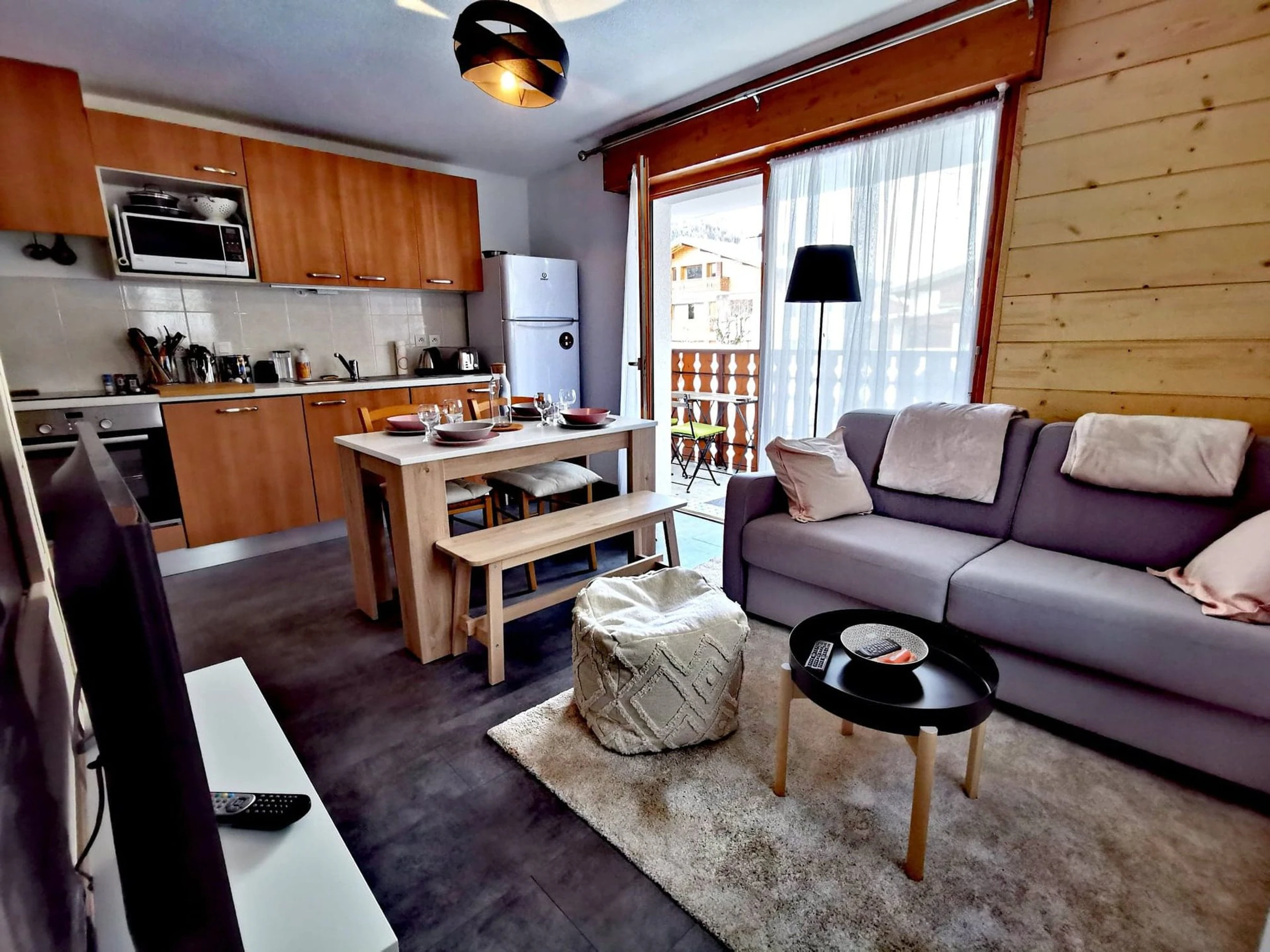 - 1 salon-séjour avec coin cuisine équipé, TV et lecteur DVD. Accès sur la terrasse par porte fenêtre