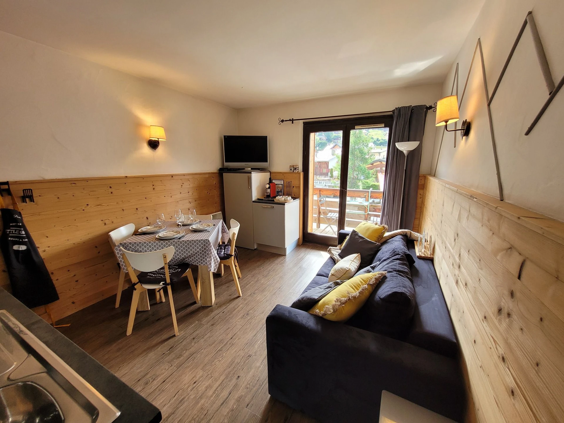 - Pièce de vie avec cuisine, canapé, TV et espace repas, accès au balcon