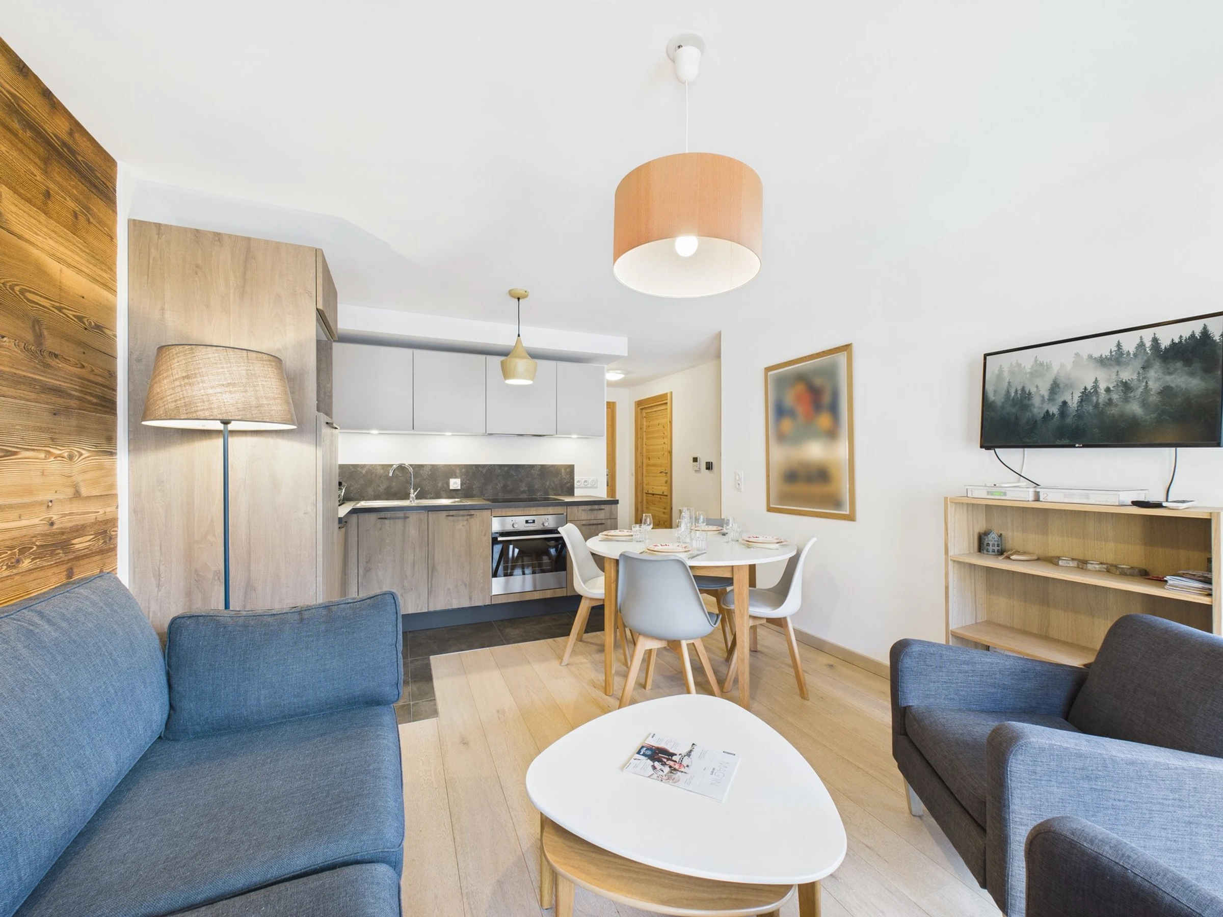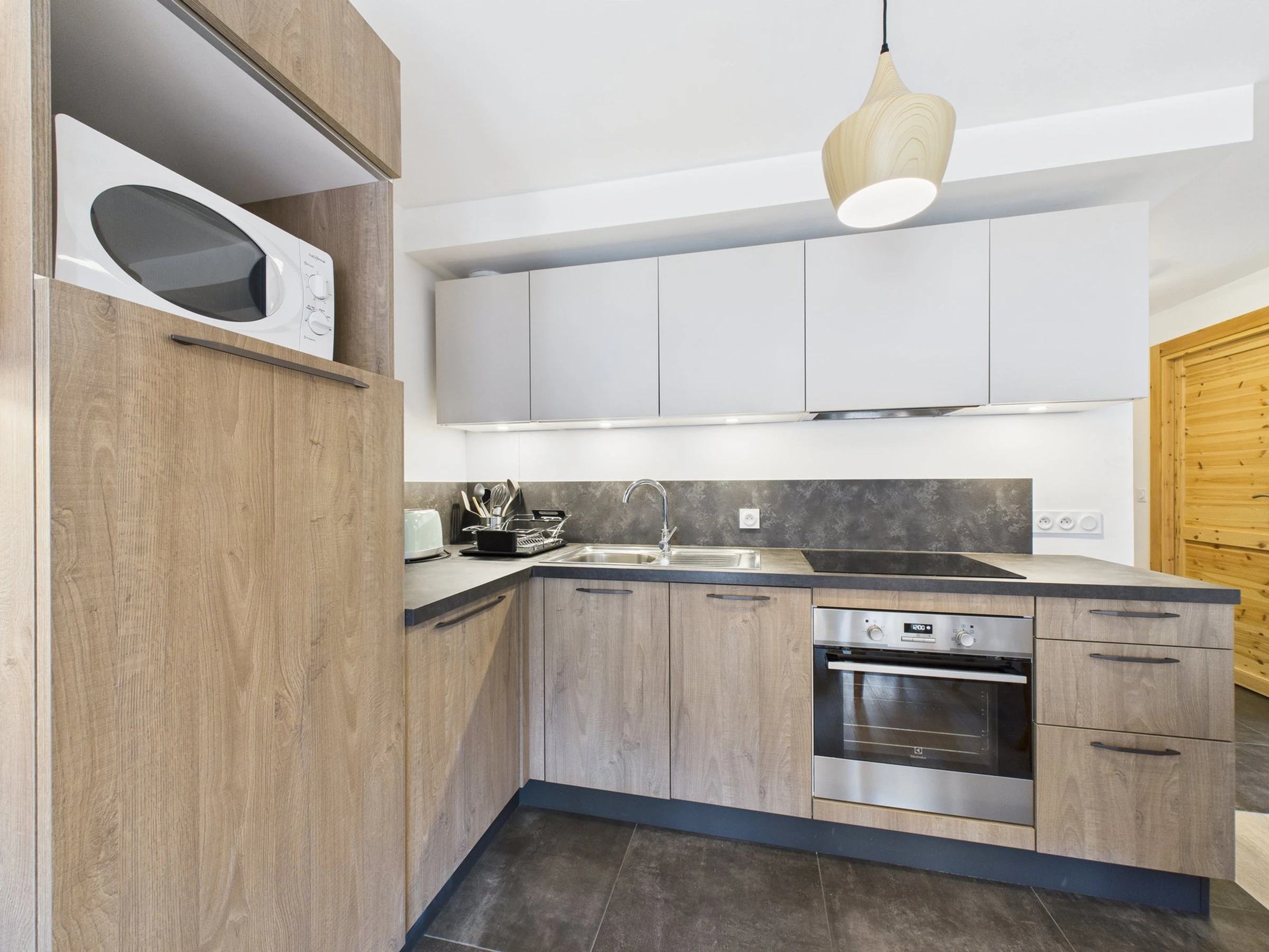 TV, lave-vaisselle, lave-linge, four, cafetière classique, plaque à induction, bouilloire, grille-pain, frigo avec compartiment congélateur, appareil à raclette. WIFI