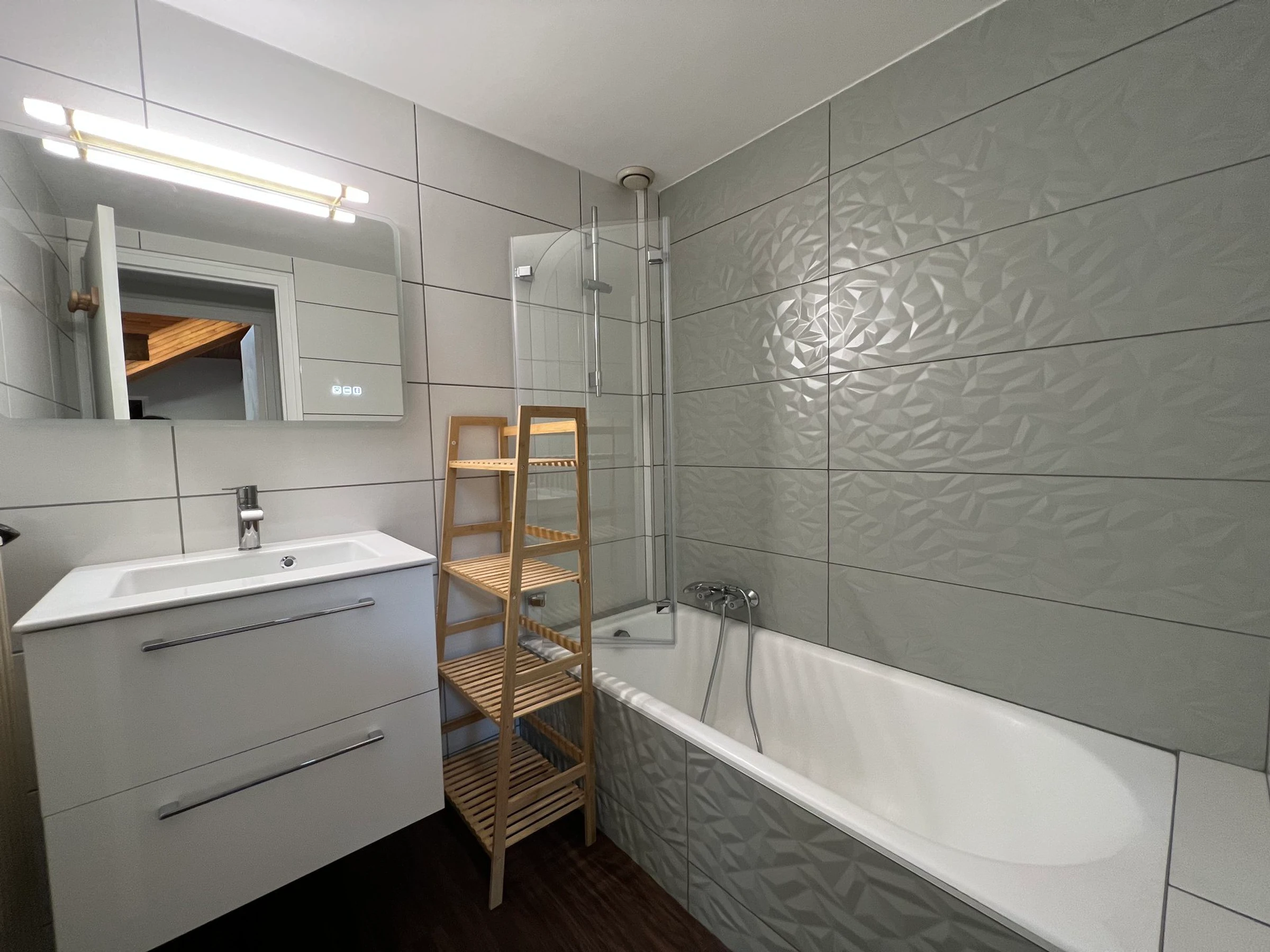 > Une salle de bain avec baignoire.