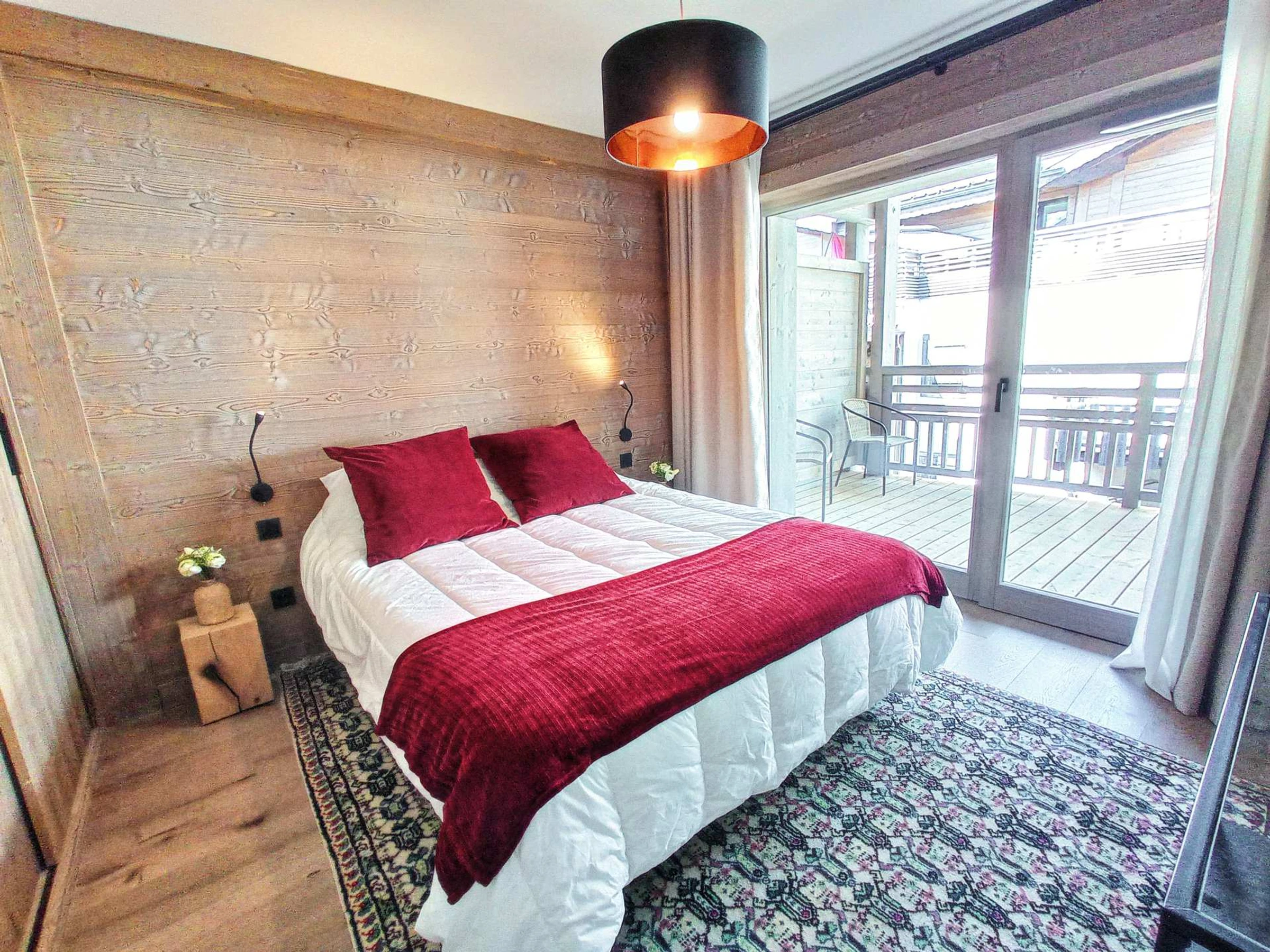 - Une chambre double, avec lit de 160cm x 190cm, TV, liseuses et placards intégrés, accès balcon exposition Nord-Est