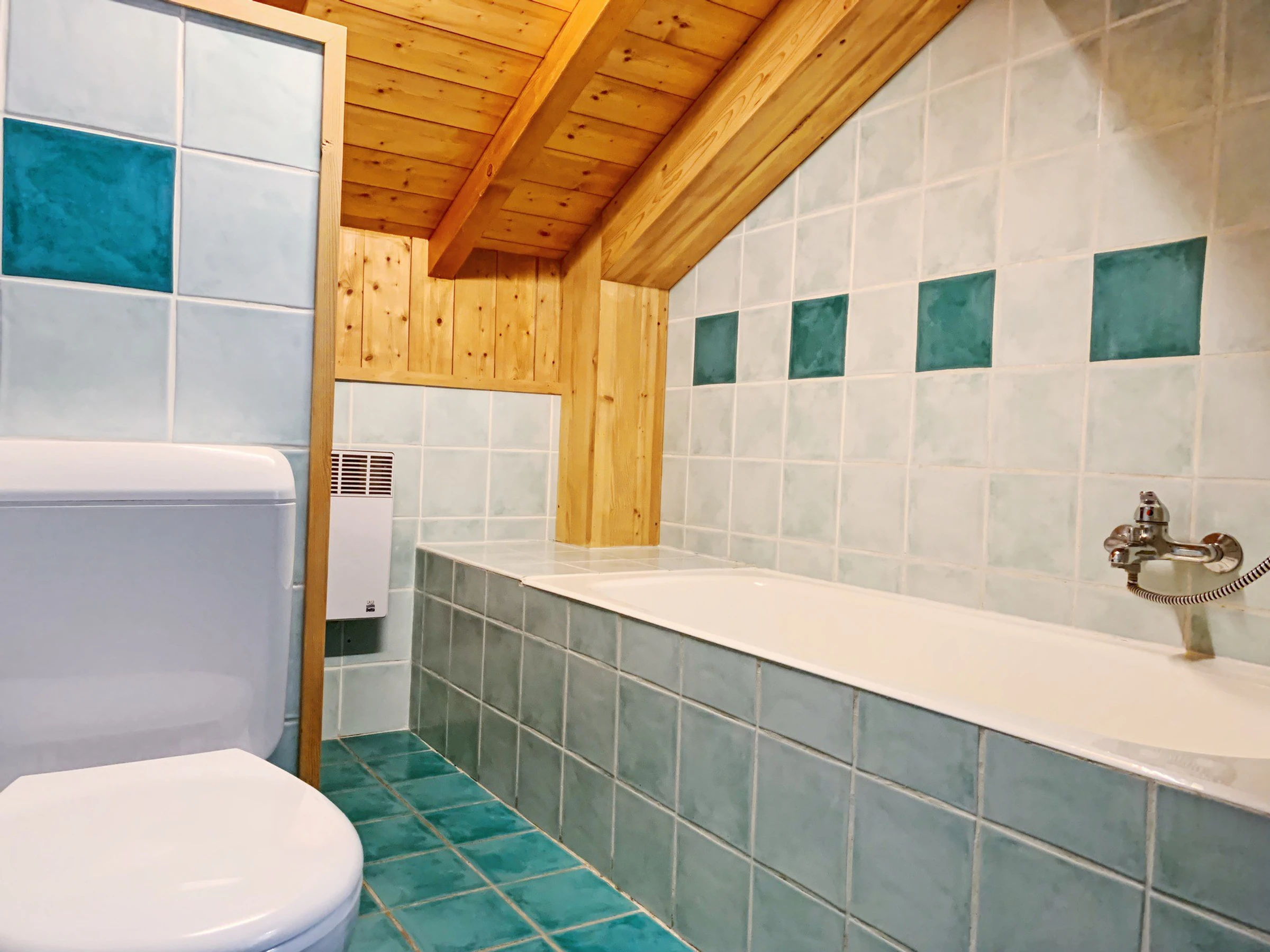 - 1 chambre avec 3 lits simples (90x190cm) en suite avec baignoire, lavabo et WC