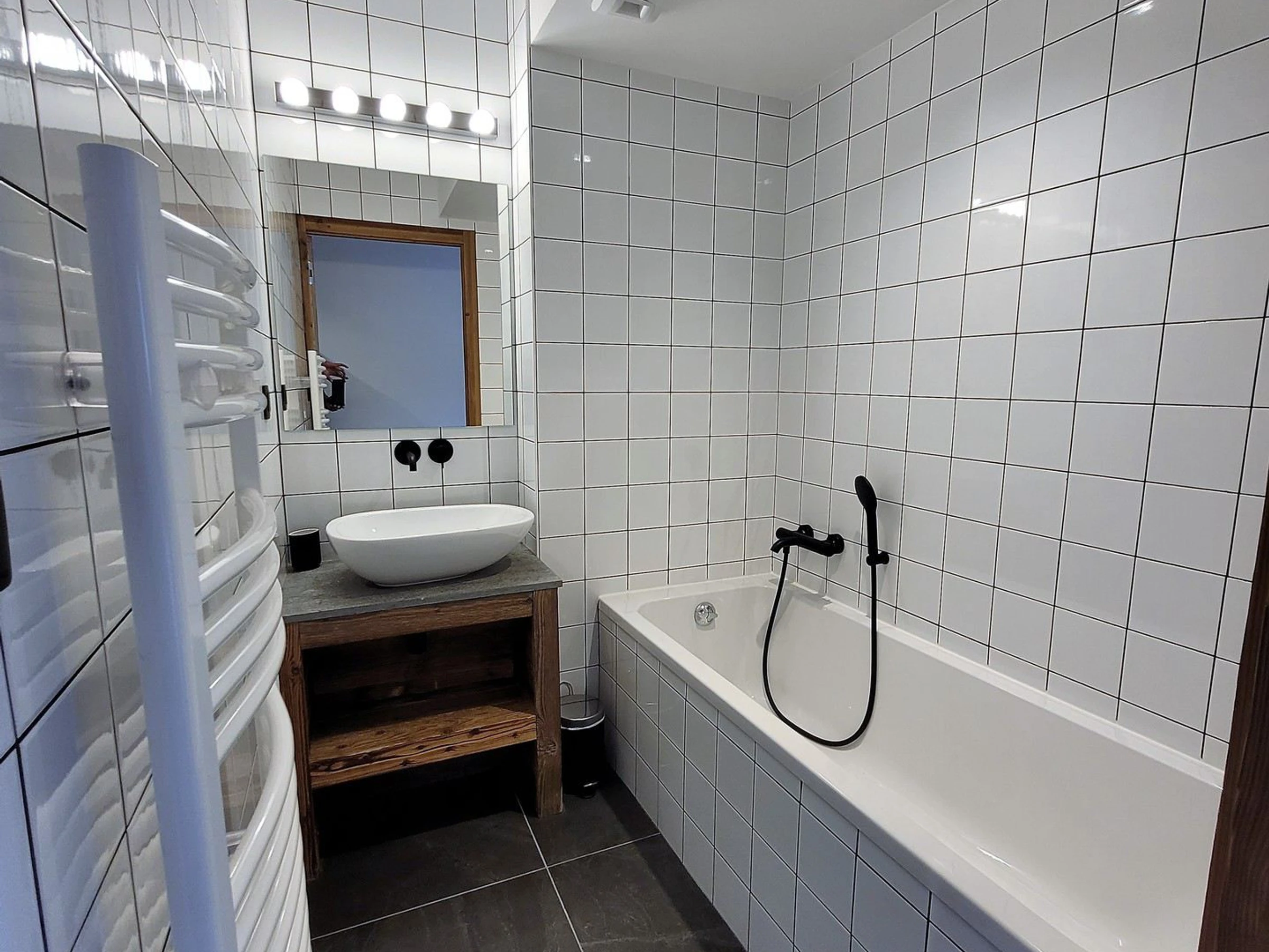 - 1 salle de bain avec baignoire, vasque et seche serviettes