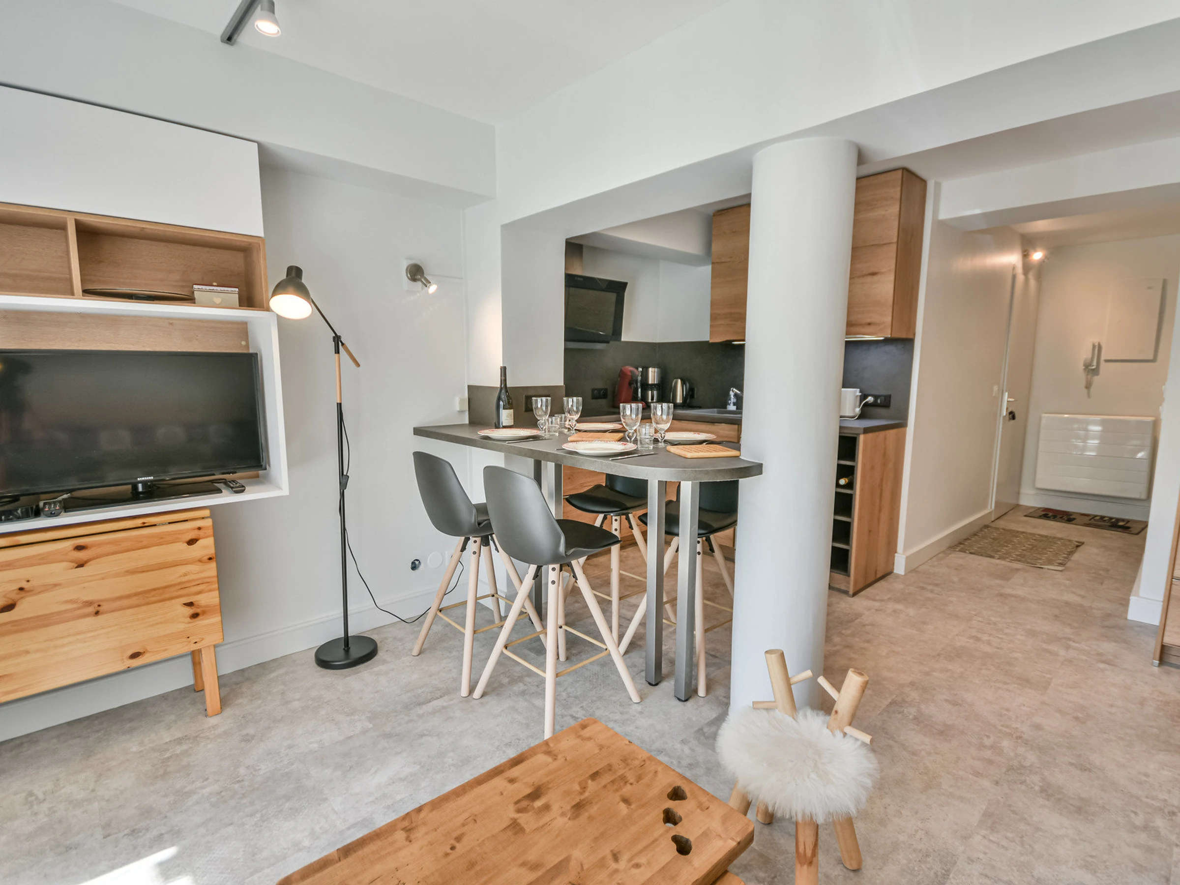 - Cuisine ouverte entièrement équipée (plaque induction x3, micro-ondes,