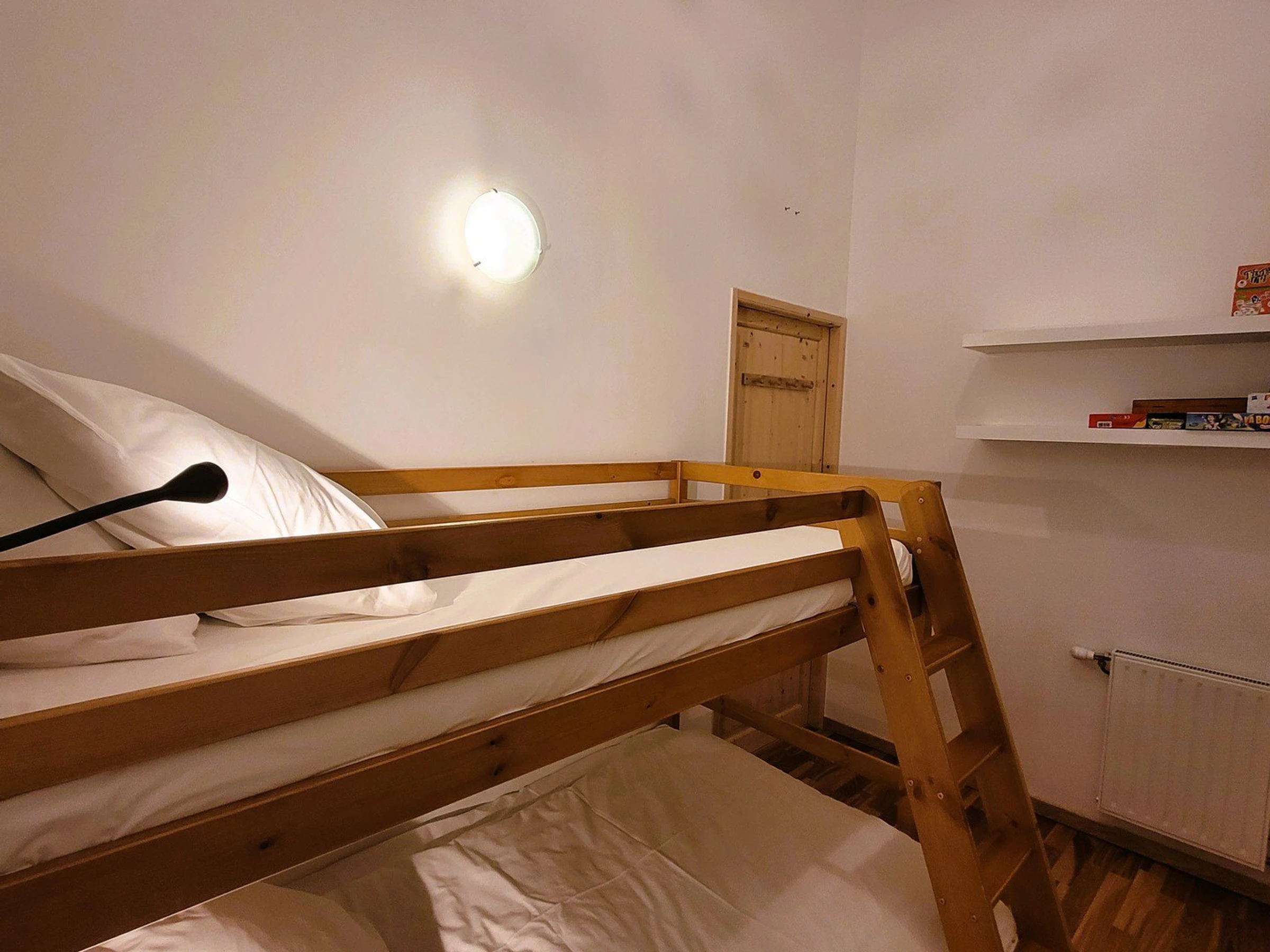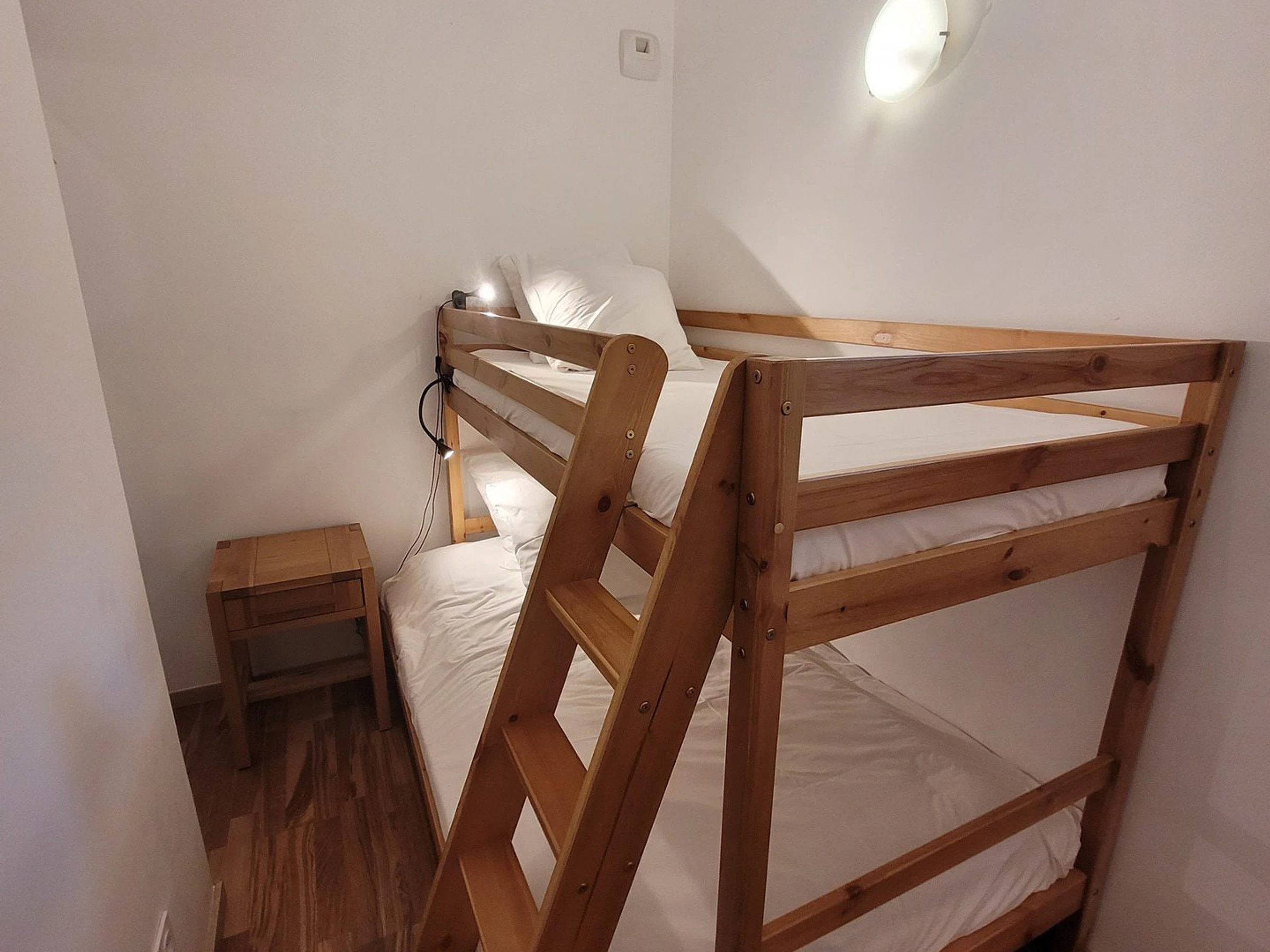 - Un espace nuit type cabine avec lits superposés (90cm en haut et 120cm en bas ) et rangement