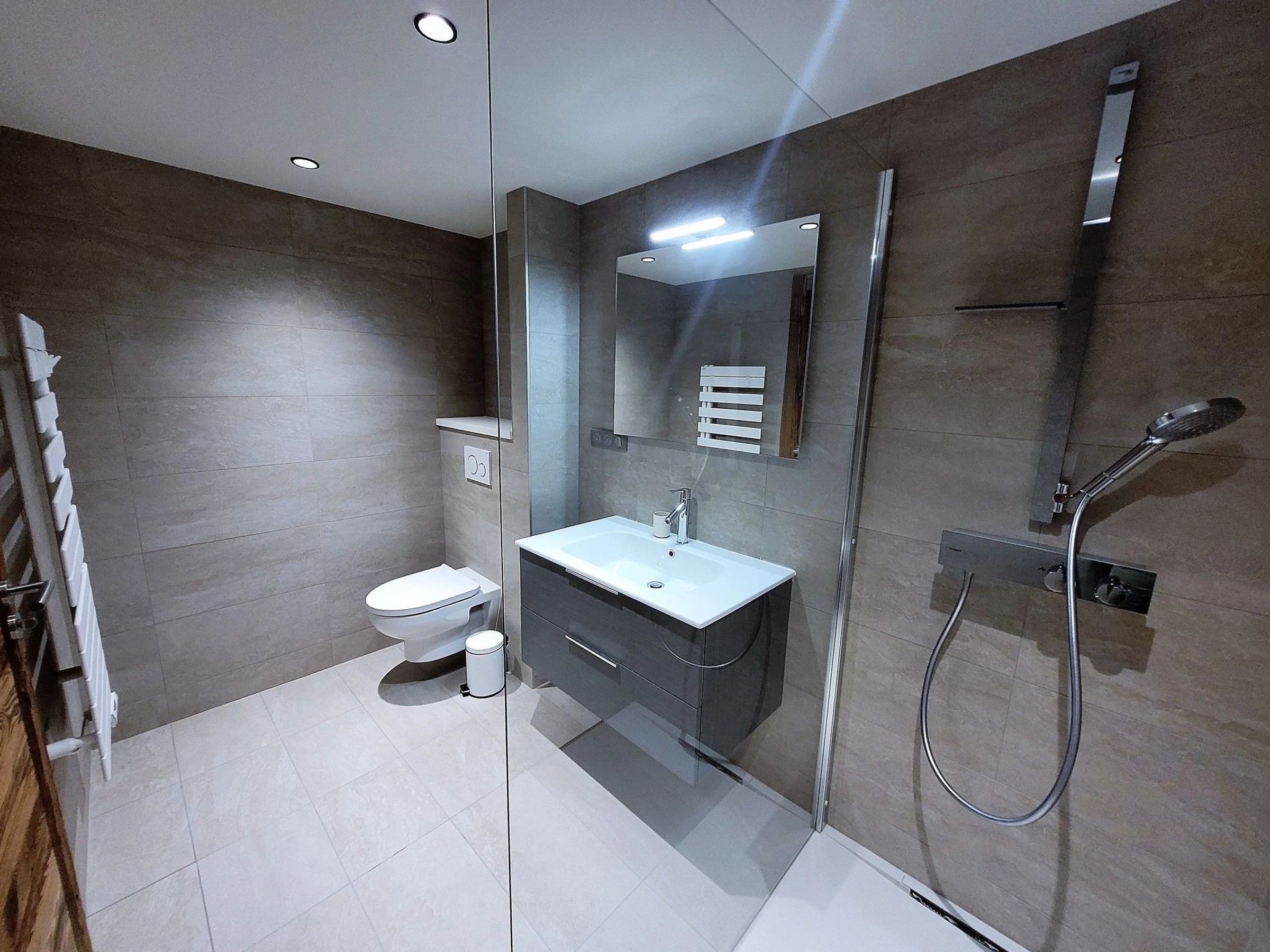 - Une chambre parentale en suite équipée d'un lit double 160cmx 190cm, douche italienne, lavabo, un WC, sèche serviettes. Balcon indépendant accessible depuis cette chambre, exposé Est