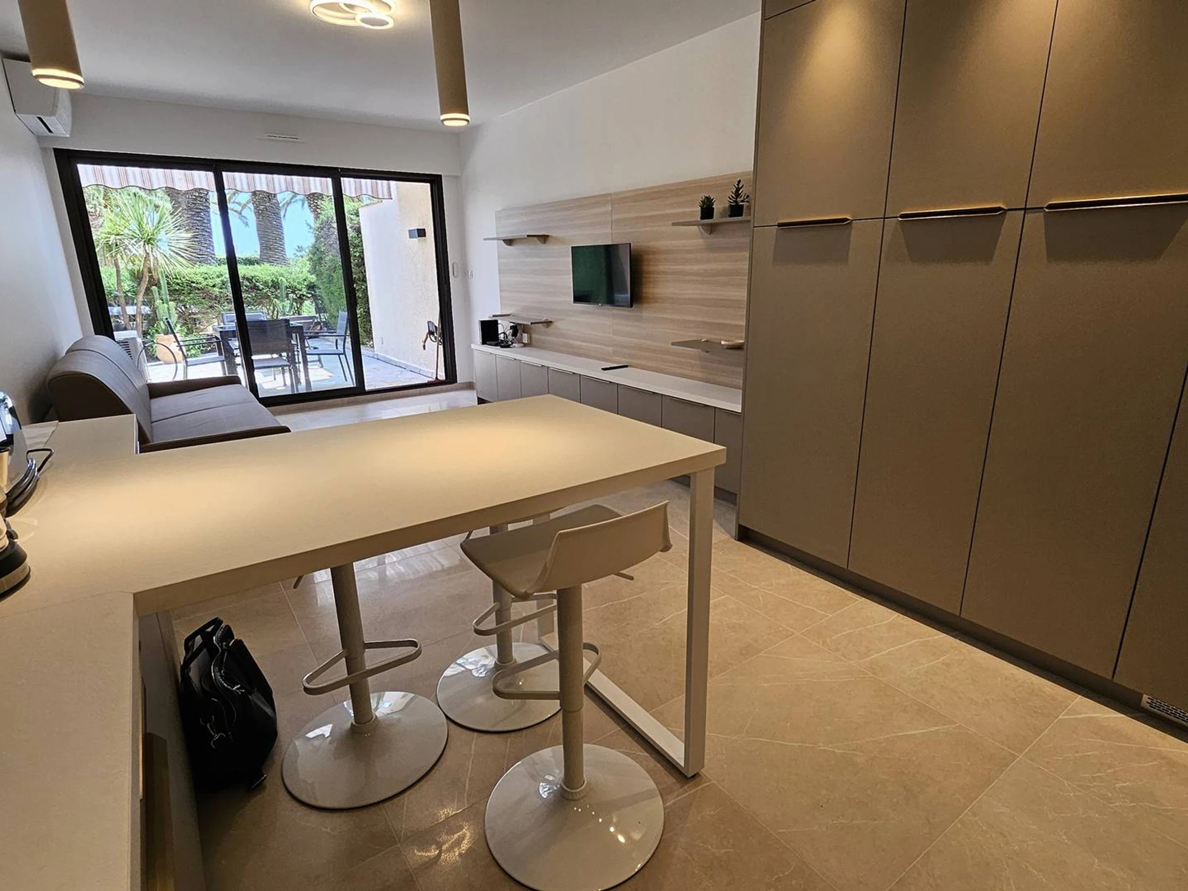 Les Issambres, Côte d'Azur, face à St Tropez, dans la Résidence "Les terrasses de la Mer", très prisée aux Issambres, ravissant studio état neuf avec climatisation, jardinet a usage privatif. Au calme de cette résidence à 200 mètres du centre village et de ses commerces, 200 mètres de la plage, piscine de la copropriété avec pataugeoire, terrain de pétanque. Composé d'une cuisine ouverte sur séjour avec convertible de 160 et un lit d'appoint de 80 dans l'entrée pour un enfant.