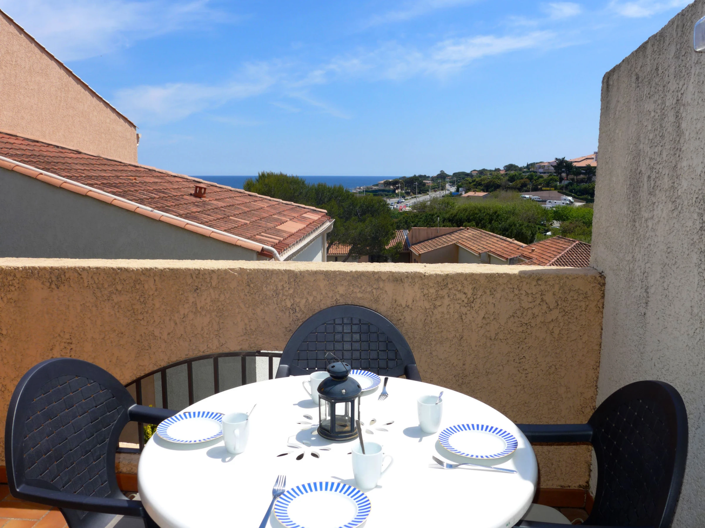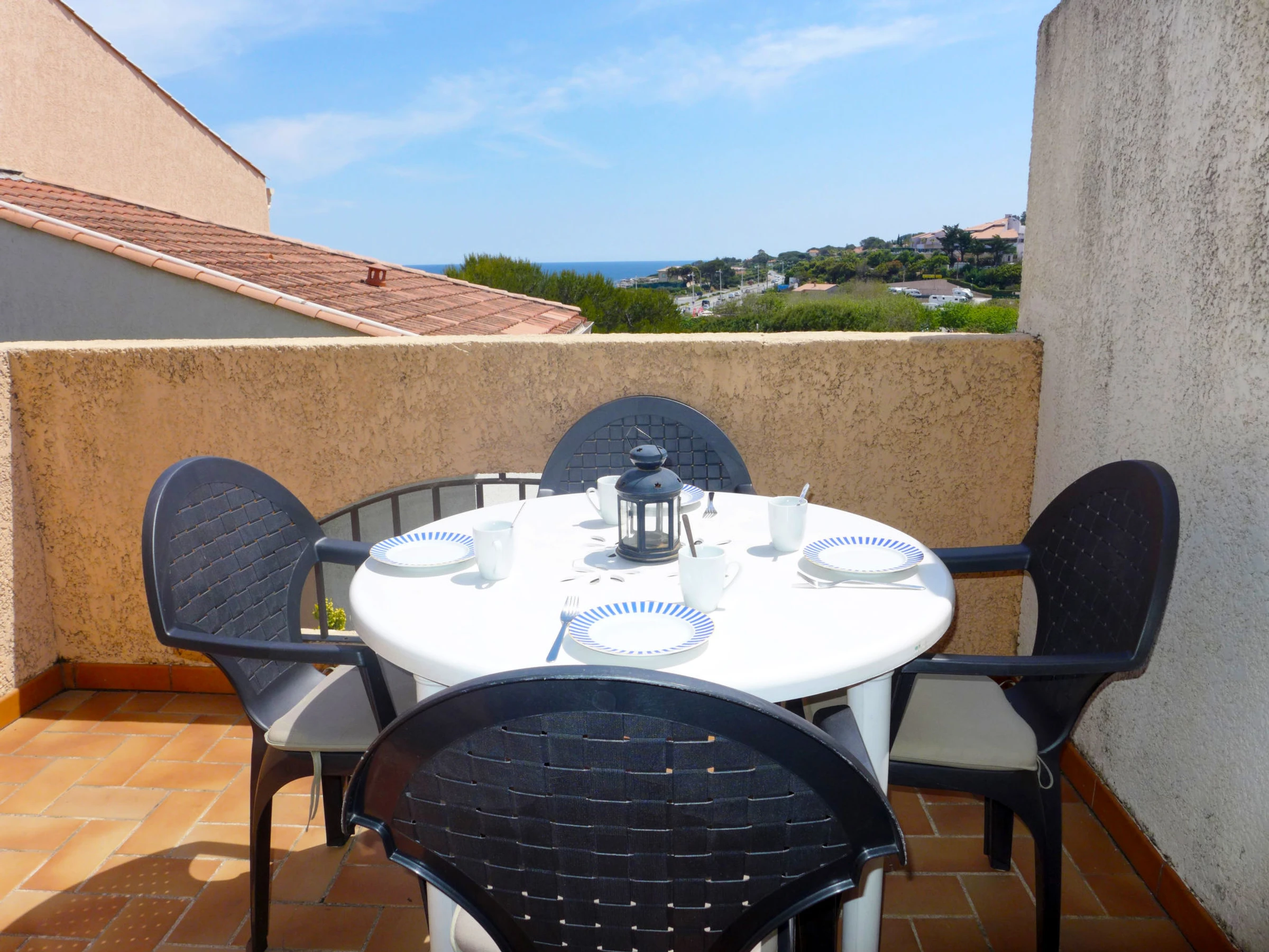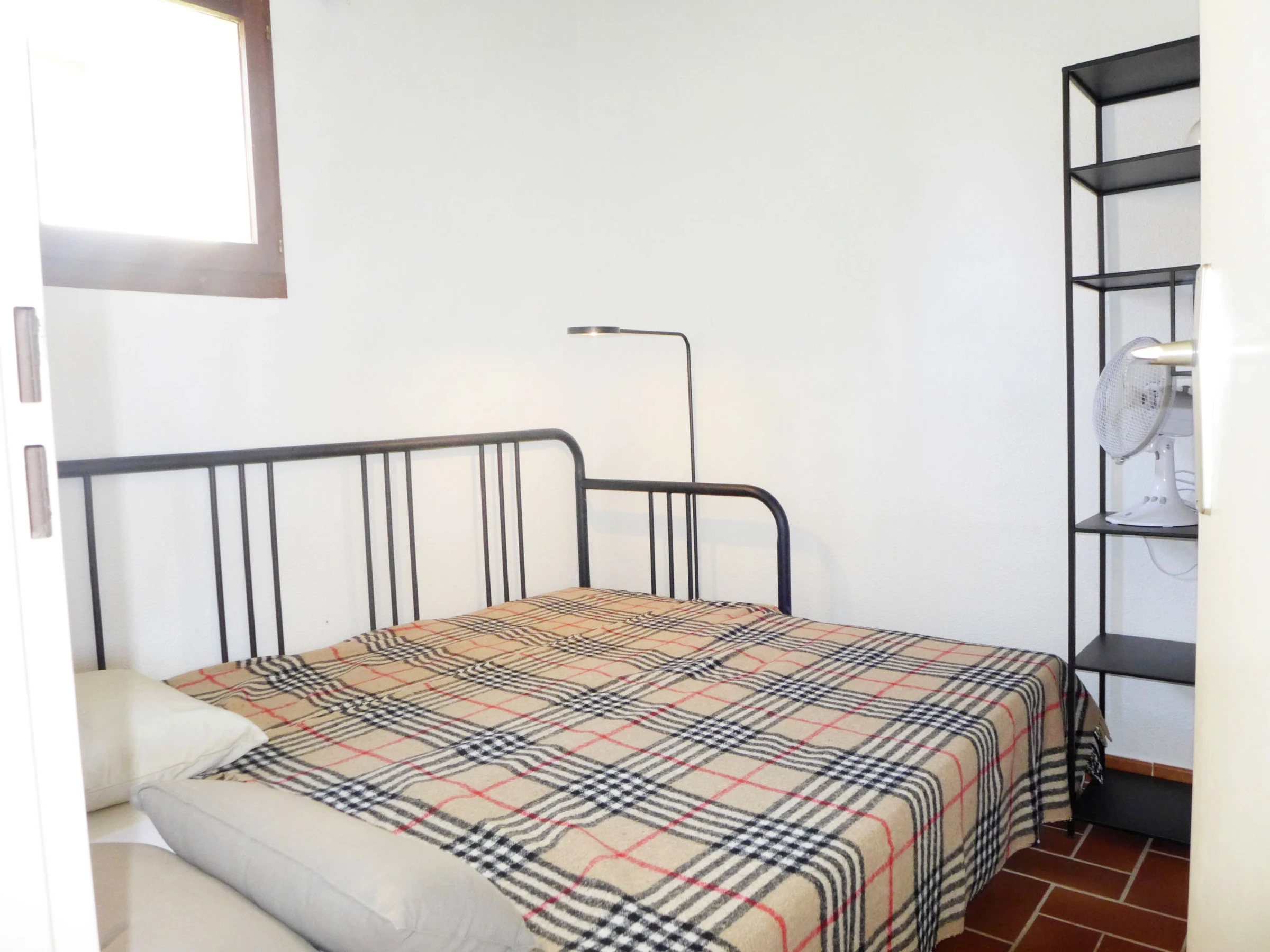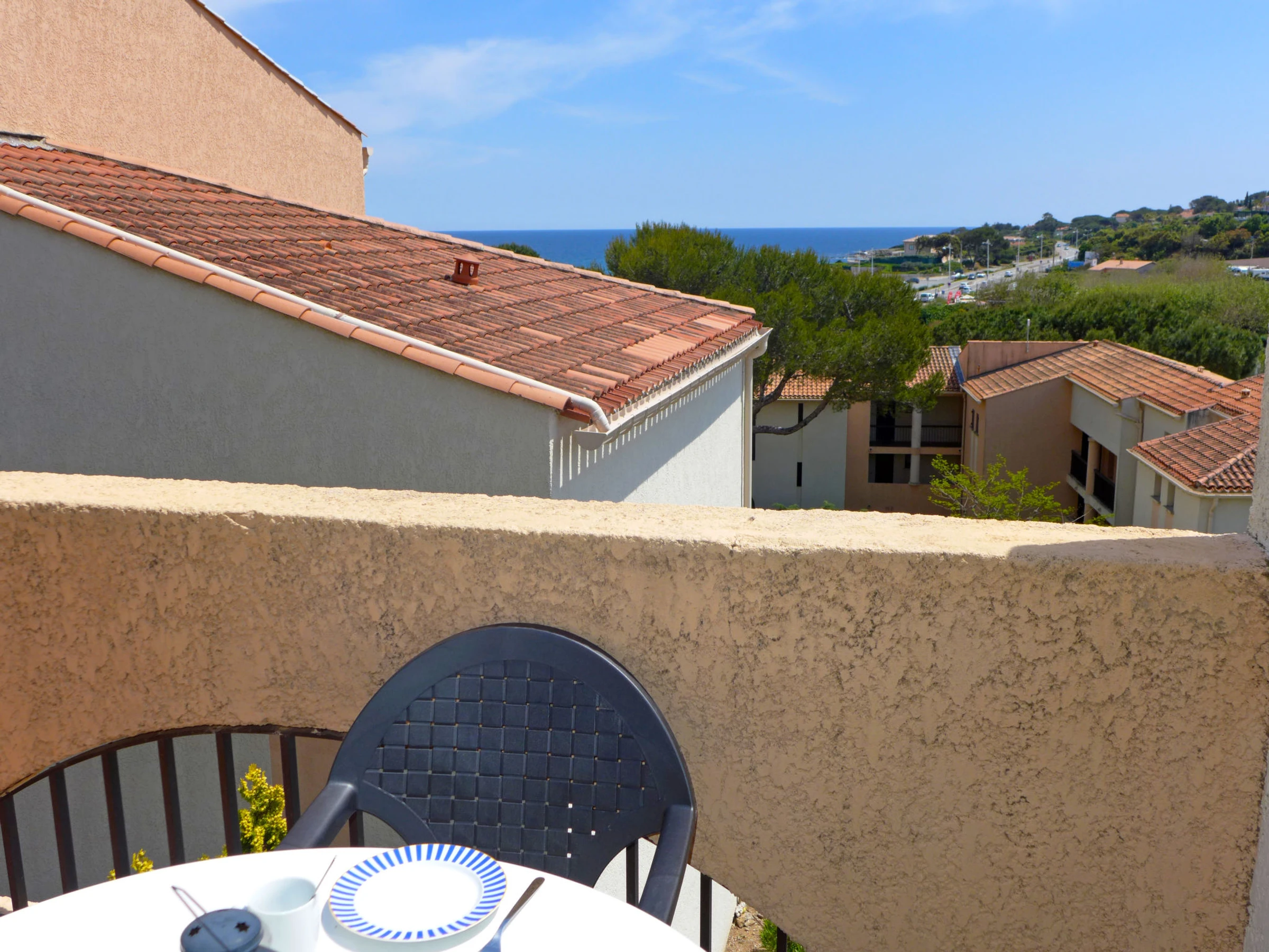 Apt 2 pièces 45 m2 au 1er étage. Séjour/salle à manger avec TV. Sortie sur la terrasse. 1 chambre avec 1 grand-lit (1 x 140 cm, longueur 190 cm), ventilateur. 1 petite chambre avec 1 lit gigogne (2 pers. 2 x 80 cm, longueur 190 cm), ventilateur. Coin cuisine (four, lave-vaisselle, 4 plaques à induction, grille-pain, bouilloire électrique, four micro-ondes, congélateur, cafetière électrique). Douche/WC. Chauffage électrique. Terrasse 6 m2. Meubles de terrasse. Vue sur la mer. A disposition: lave-linge, fer à repasser. Internet (Connexion WIFI, en sus). Place de parking No A115/399. Veuillez noter: TV seulement FR. Détecteur de fumée. [hidden]