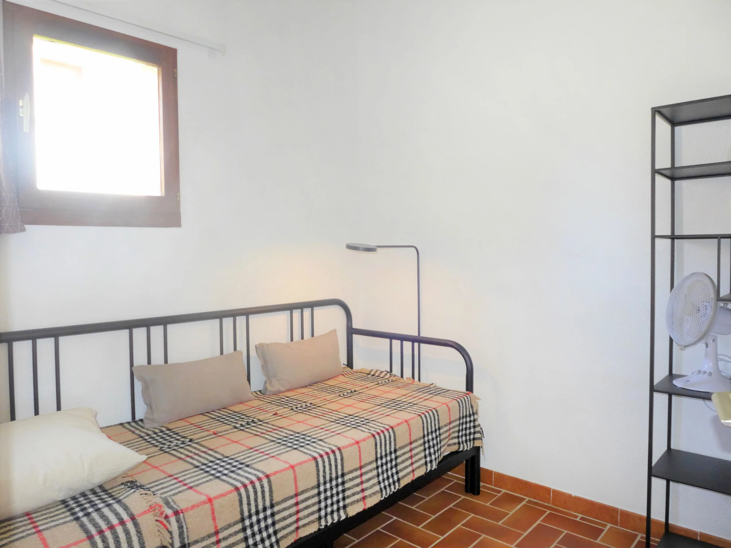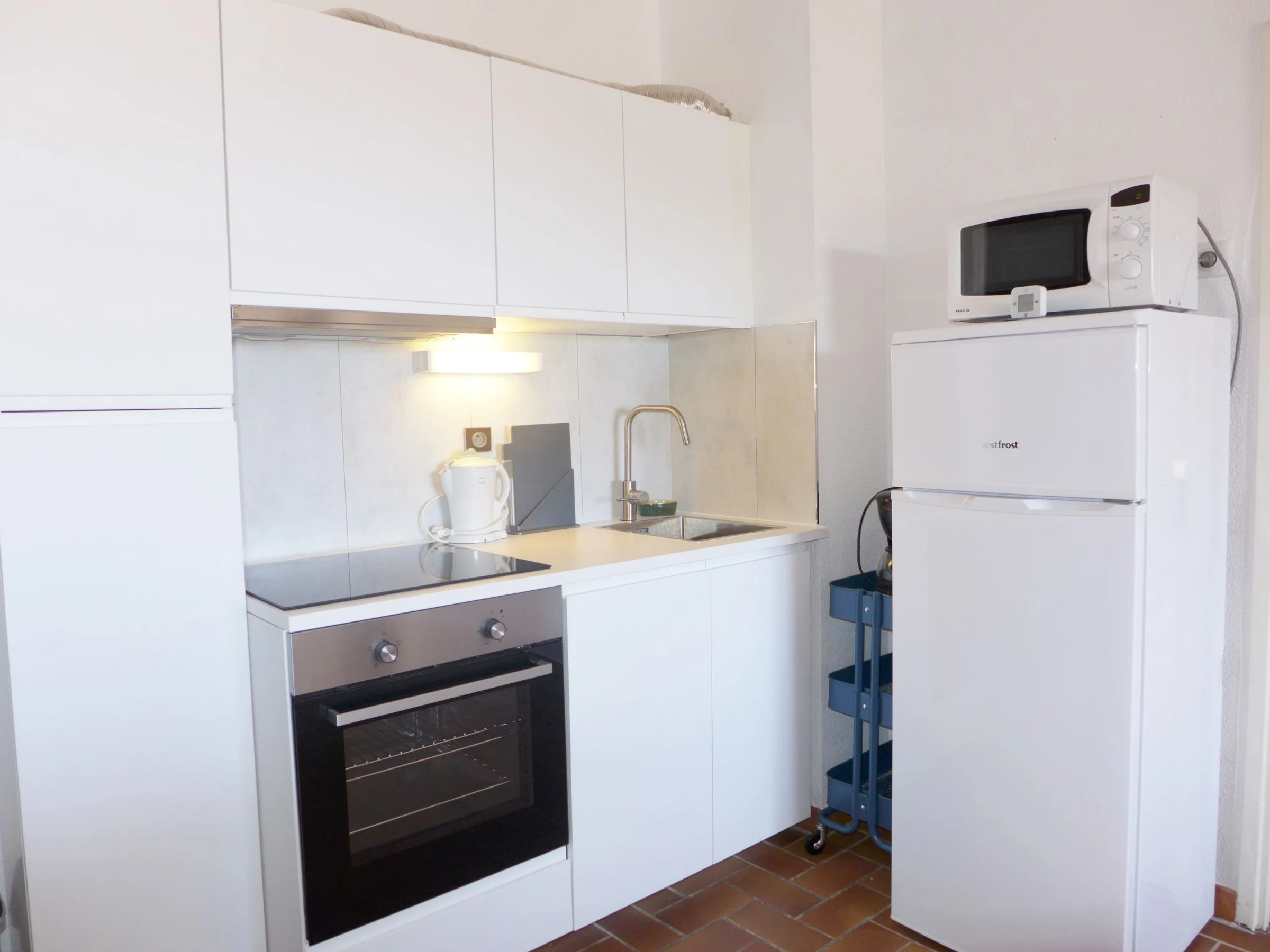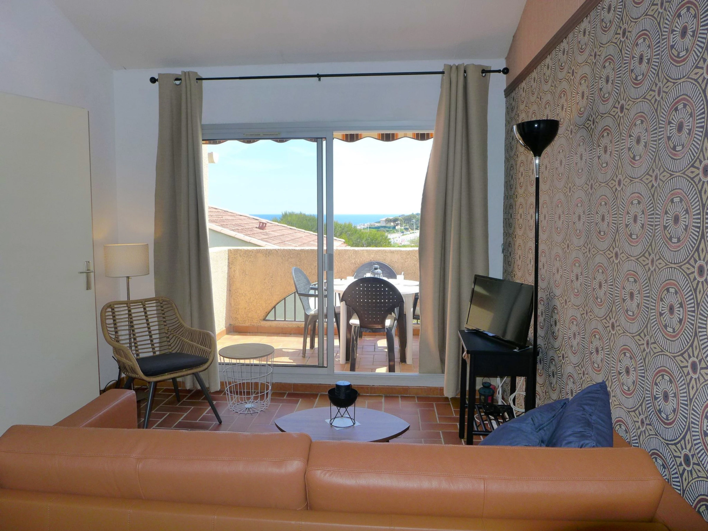 Apt 2 pièces 45 m2 au 1er étage. Séjour/salle à manger avec TV. Sortie sur la terrasse. 1 chambre avec 1 grand-lit (1 x 140 cm, longueur 190 cm), ventilateur. 1 petite chambre avec 1 lit gigogne (2 pers. 2 x 80 cm, longueur 190 cm), ventilateur. Coin cuisine (four, lave-vaisselle, 4 plaques à induction, grille-pain, bouilloire électrique, four micro-ondes, congélateur, cafetière électrique). Douche/WC. Chauffage électrique. Terrasse 6 m2. Meubles de terrasse. Vue sur la mer. A disposition: lave-linge, fer à repasser. Internet (Connexion WIFI, en sus). Place de parking No A115/399. Veuillez noter: TV seulement FR. Détecteur de fumée. [hidden]