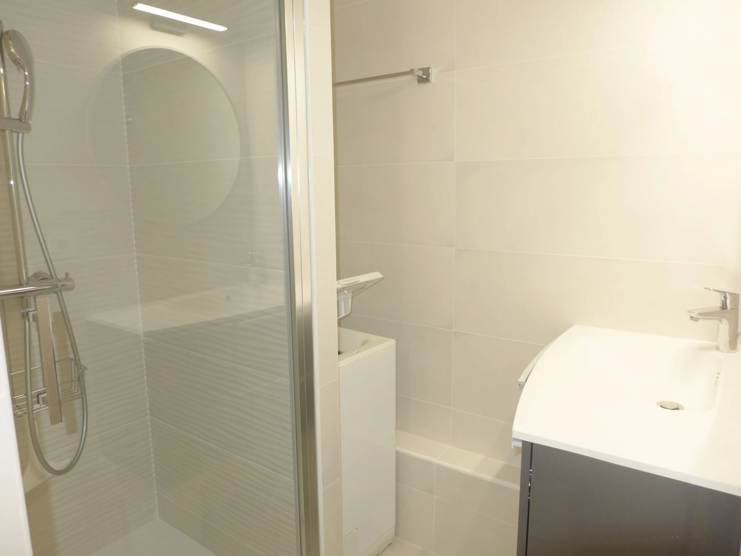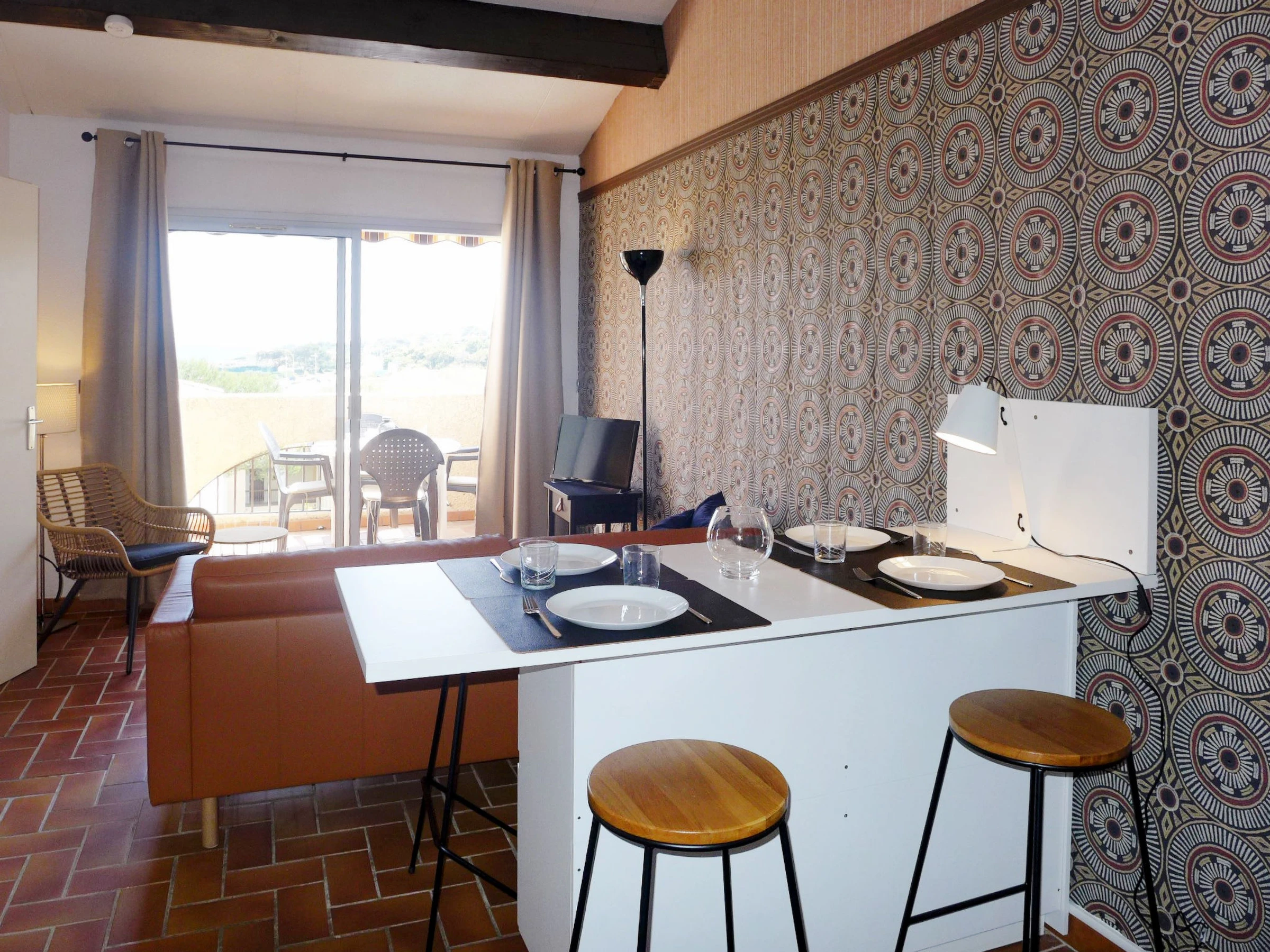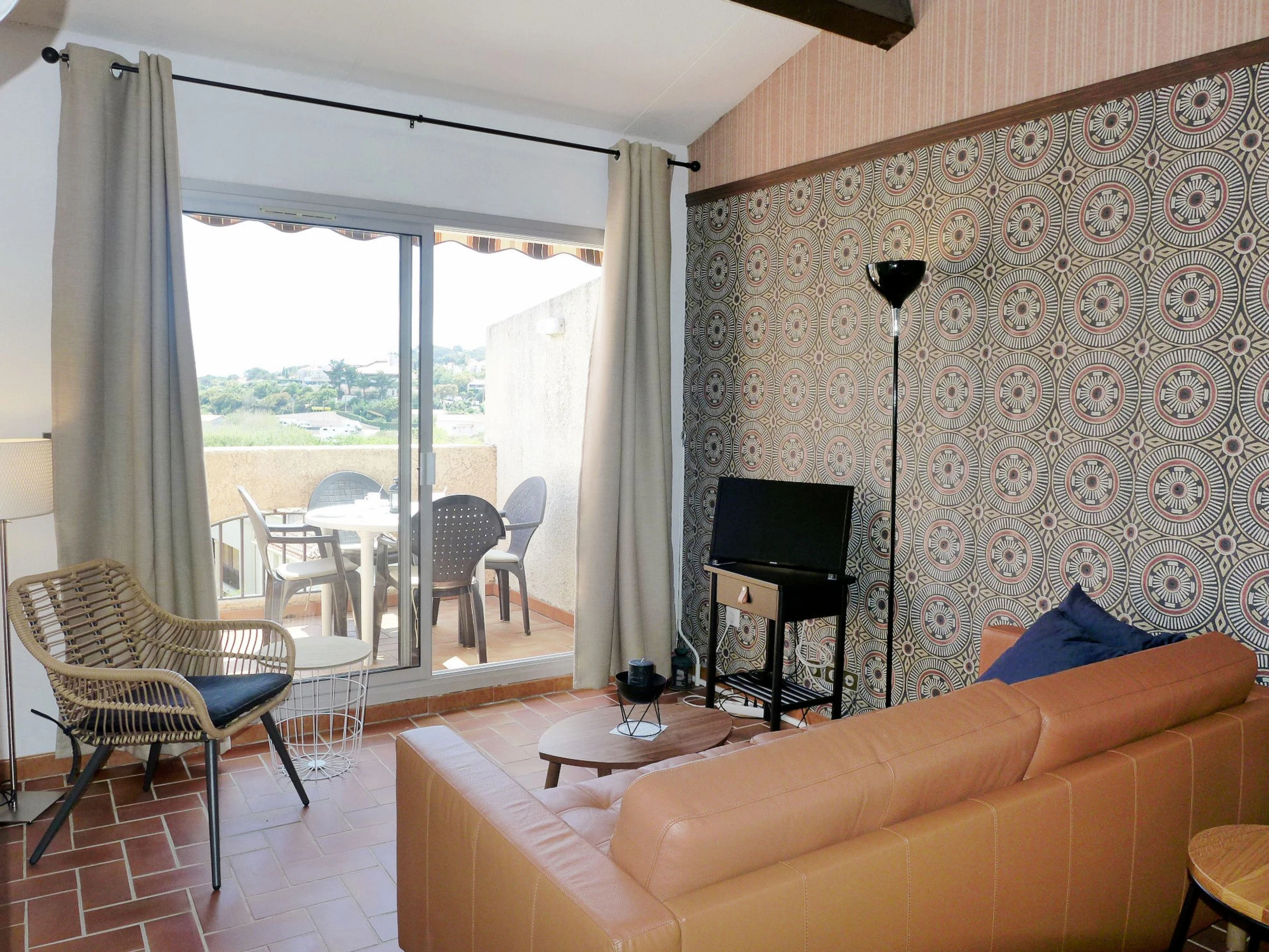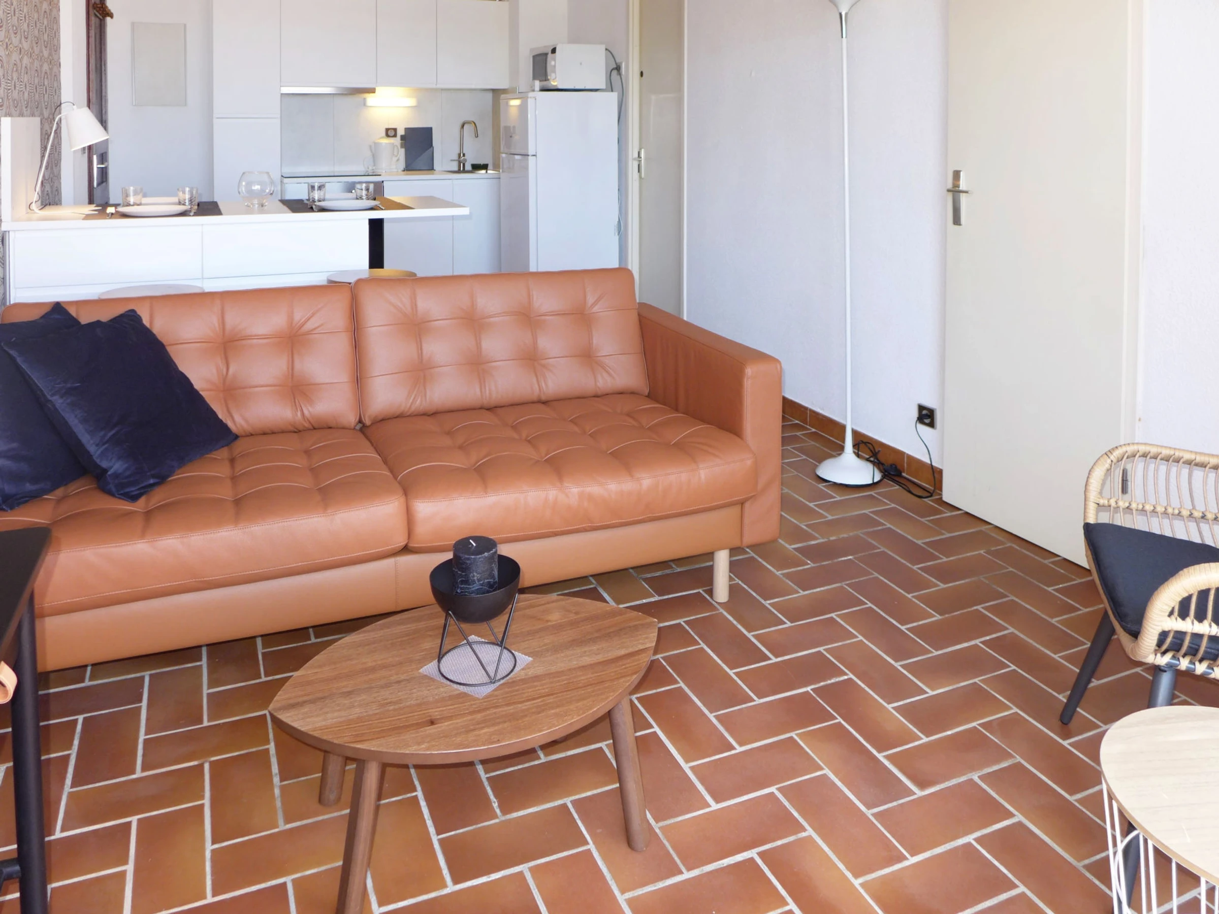 Apt 2 pièces 45 m2 au 1er étage. Séjour/salle à manger avec TV. Sortie sur la terrasse. 1 chambre avec 1 grand-lit (1 x 140 cm, longueur 190 cm), ventilateur. 1 petite chambre avec 1 lit gigogne (2 pers. 2 x 80 cm, longueur 190 cm), ventilateur. Coin cuisine (four, lave-vaisselle, 4 plaques à induction, grille-pain, bouilloire électrique, four micro-ondes, congélateur, cafetière électrique). Douche/WC. Chauffage électrique. Terrasse 6 m2. Meubles de terrasse. Vue sur la mer. A disposition: lave-linge, fer à repasser. Internet (Connexion WIFI, en sus). Place de parking No A115/399. Veuillez noter: TV seulement FR. Détecteur de fumée. [hidden]